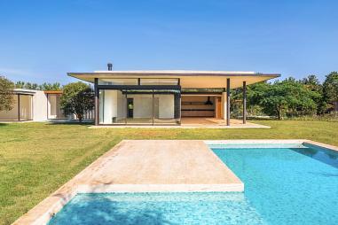 Os ambientes da casa são iluminados e arejados, graças às portas-camarão e janelas que permitem a entrada de luz natural. O pé-direito alto reforça a sensação de tranquilidade e sossego, proporcionando um ambiente acolhedor e convidativo.