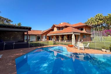 A casa ainda oferece total autonomia com poço artesiano e cisterna, além de garagem coberta para visitantes e dependência completa para funcionários.