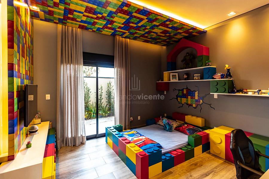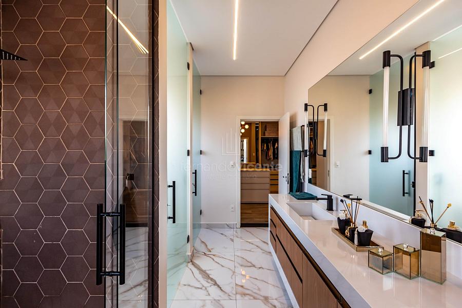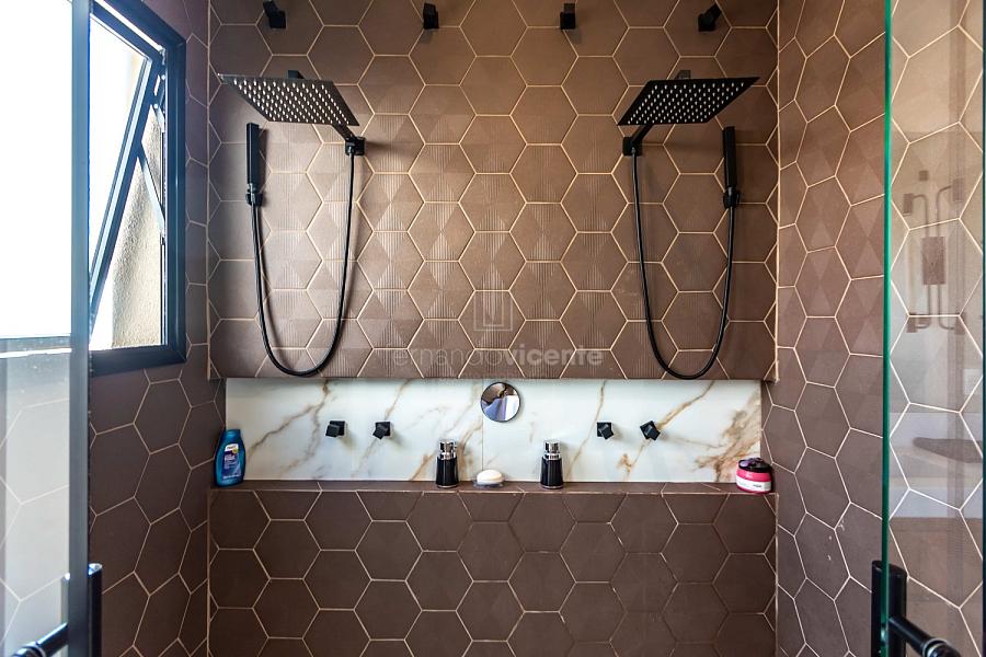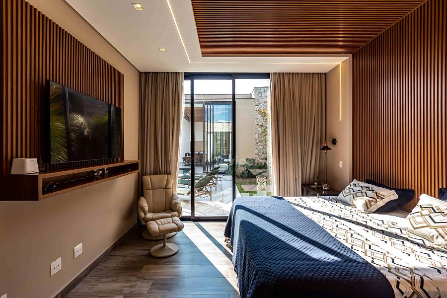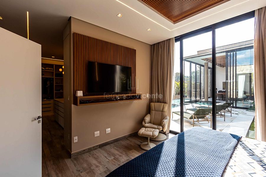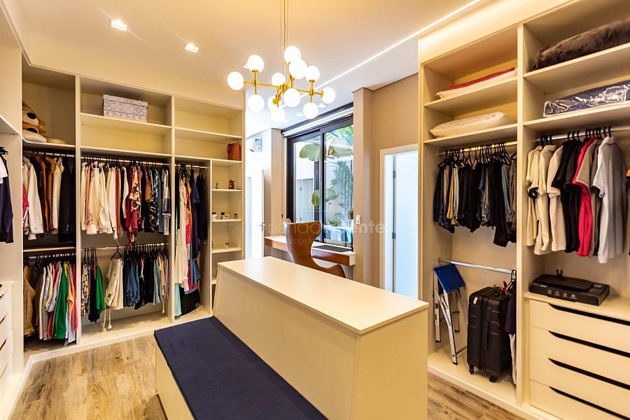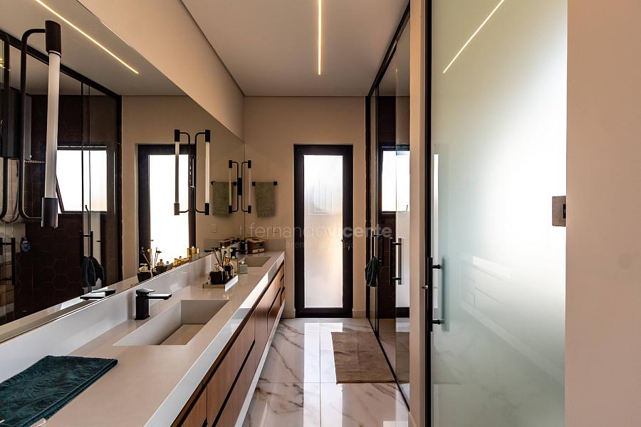 Com quatro suítes, todas com closets espaçosos, a suíte master é especialmente linda. Com dois WCS isolados, cuba dupla, ducha dupla e um box de vidro que se estende até o teto. Além disso, um escritório interno na suíte master oferece o espaço ideal para momentos de foco e tranquilidade. Um verdadeiro oásis particular. A ampla sala com pé direito de 5,5 metros cria uma atmosfera de amplitude e grandiosidade sem perder o aconchego e a elegância.