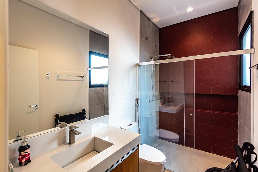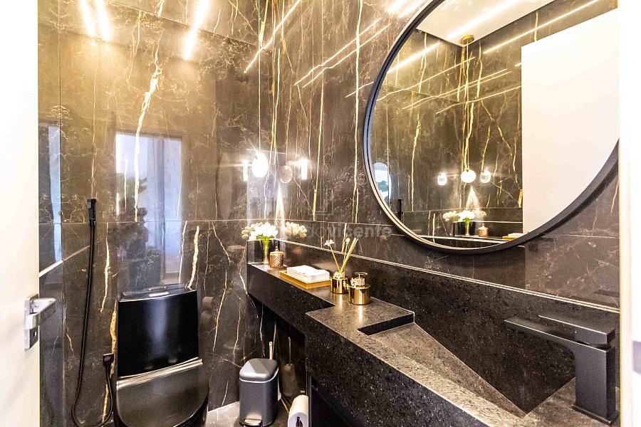 Seis banheiros no total garantem a conveniência para todos os residentes e convidados. O lavabo, elegante e funcional, é um toque de sofisticação adicional. A área de lavanderia oferece praticidade para o dia a dia.
