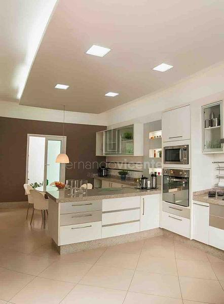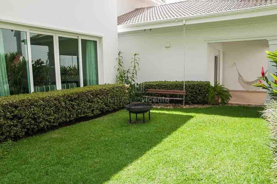O piso inferior abriga três suítes, sendo uma máster com varanda, closet e um banheiro luxuoso com dois chuveiros e duas pias. Duas suítes possuem móveis planejados, uma delas configurada como escritório com acesso direto ao jardim externo. A cozinha, também planejada e equipada, integra-se à sala de almoço, promovendo um ambiente acolhedor.