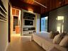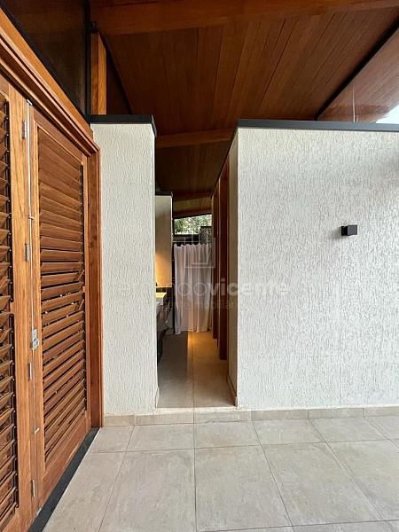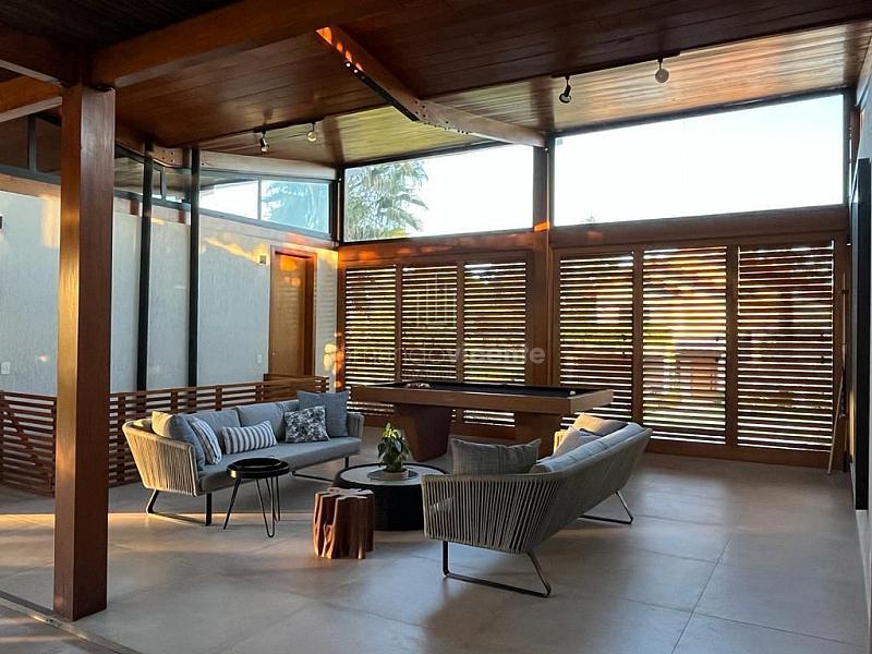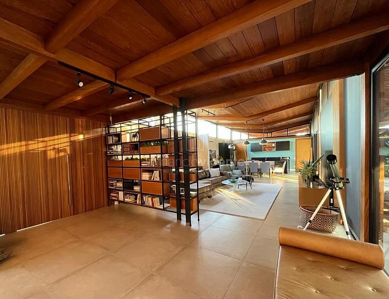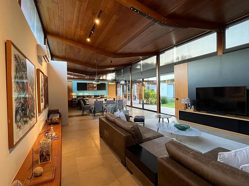 Projeto único, a residência tem um telhado com design diferenciado em todo teto e venezianas em madeira. A iluminação natural foi privilegiada com seu pé direito de 4,5 m.
