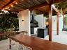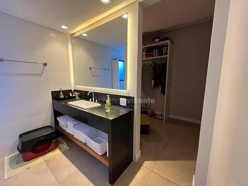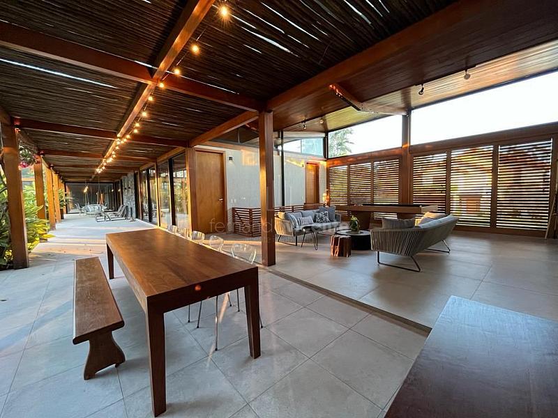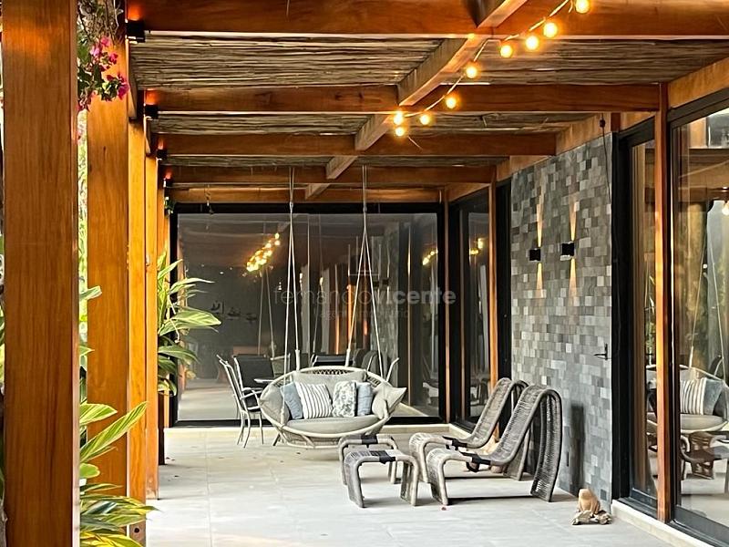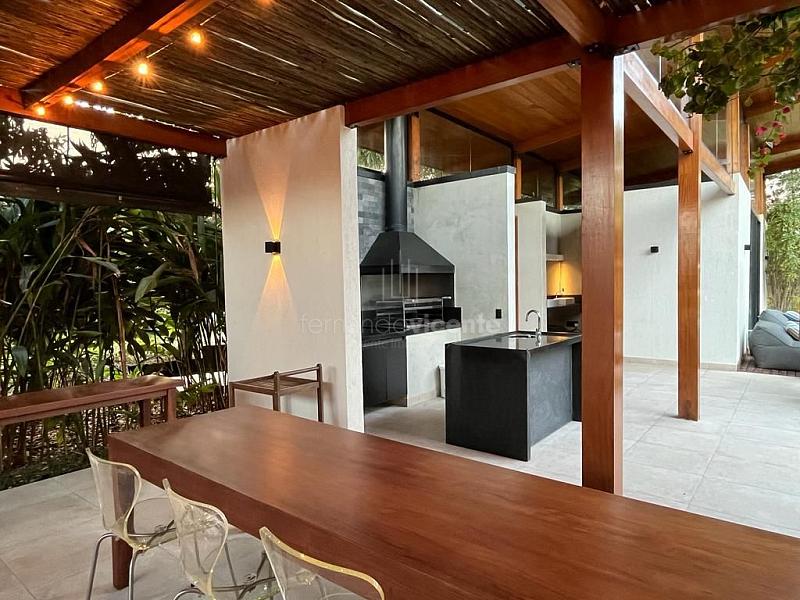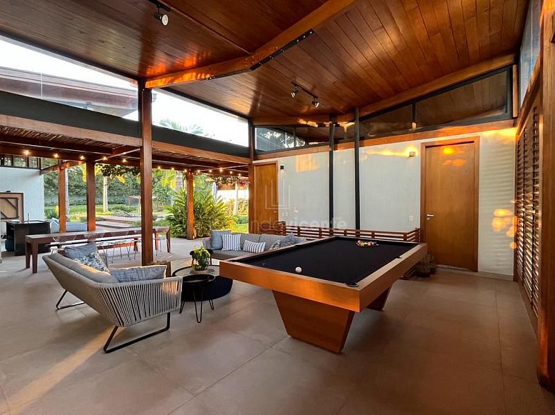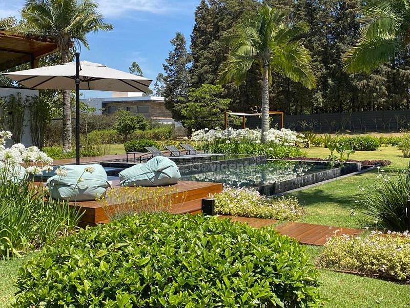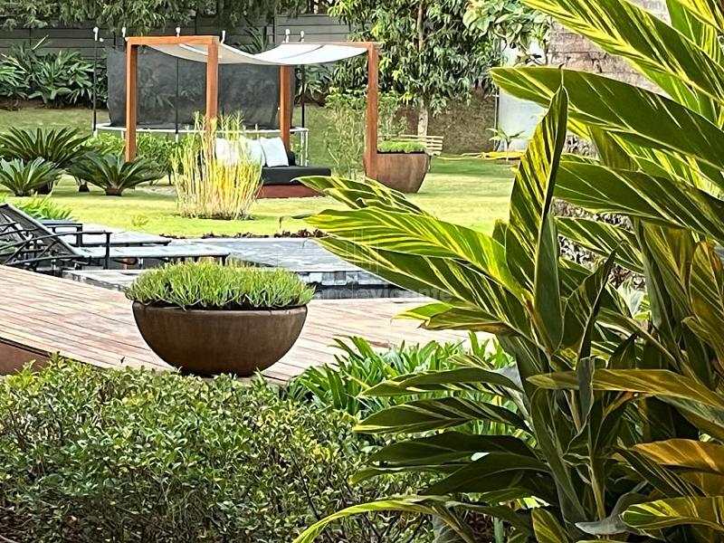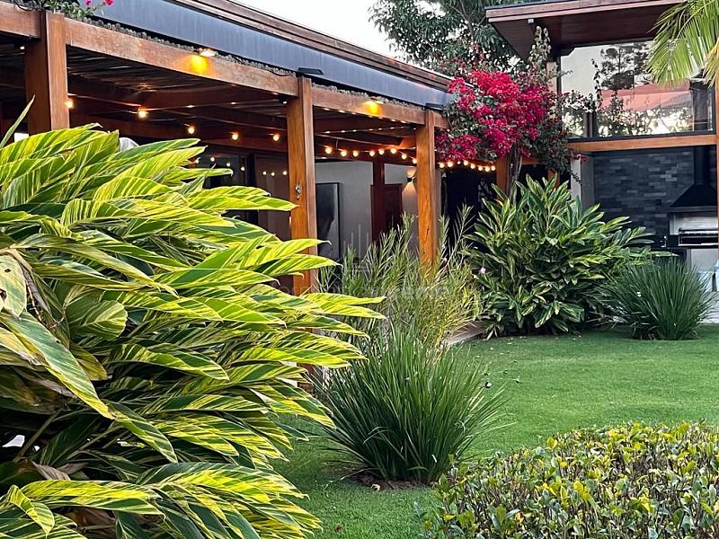 Construída em formato de J, é totalmente voltada para a área do jardim. O paisagismo exuberante é a peça central desse cenário composto por piscina com pedra vulcânica, prainha com espreguiçadeiras, hidromassagem.