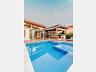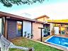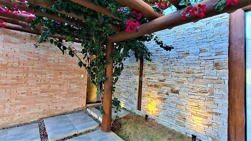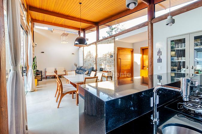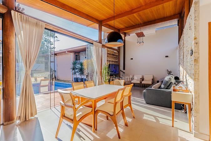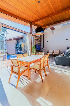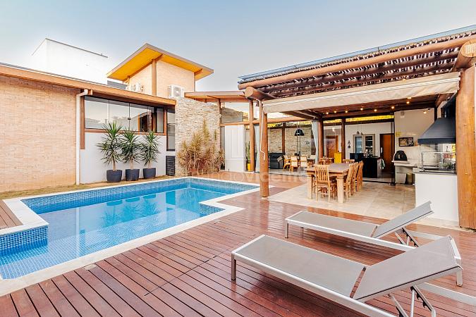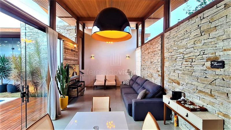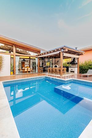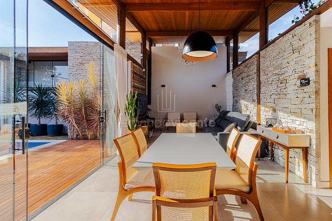 Na área externa contempla quintal com gramado, piscina, espaço gourmet integrado á cozinha. Incluindo paisagismo deslumbrante ao redor de toda casa, além de fazer fundos para área verde com lindo pôr-do-sol.