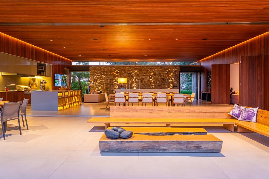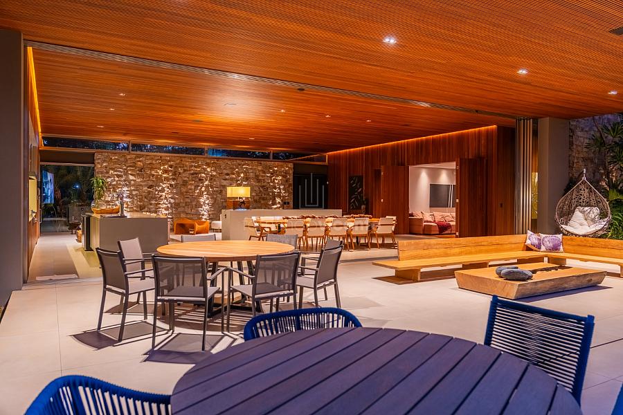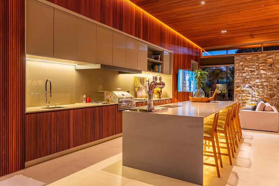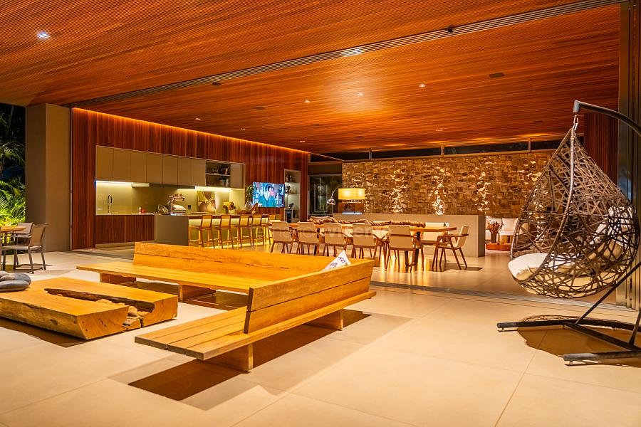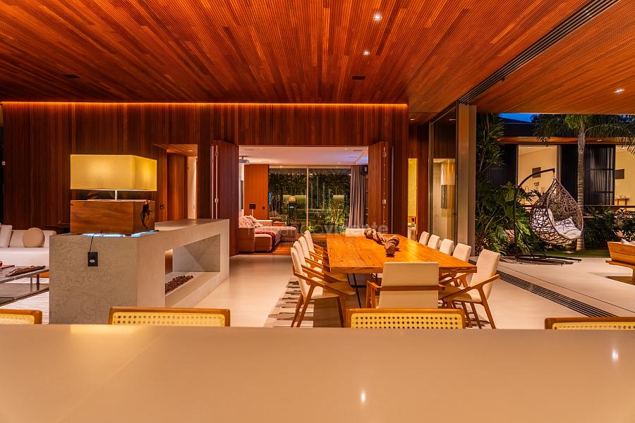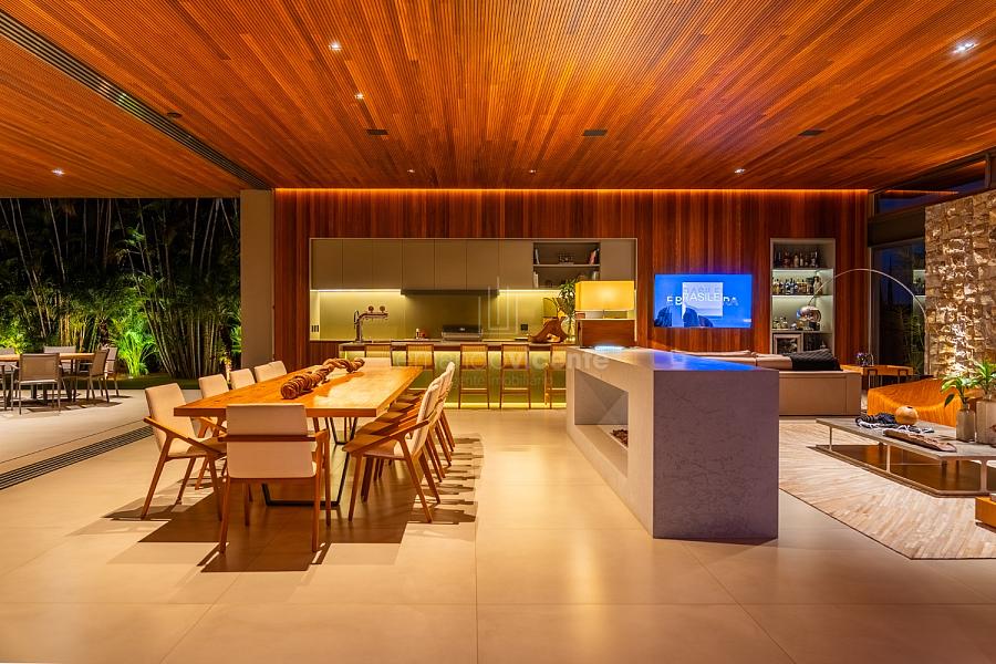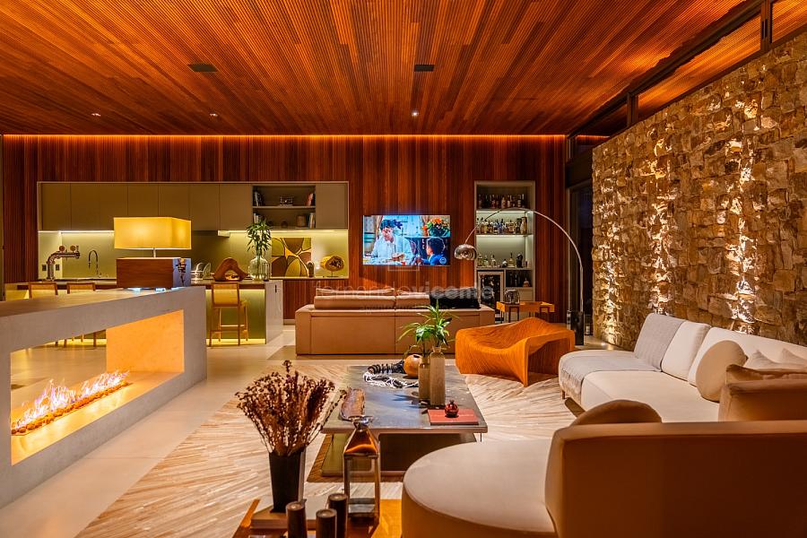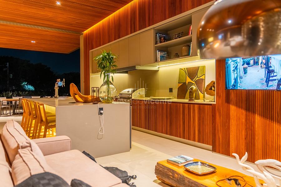 Os ambientes integrados, que unem a sala de estar, sala de jantar e área gourmet, são o coração da casa, criados para celebrar momentos inesquecíveis. A decoração de bom gosto e as esquadrias minimalistas garantem uma atmosfera leve e convidativa. Para os momentos de relaxamento, a casa conta com um aconchegante home theater.