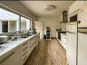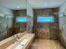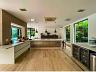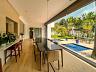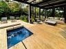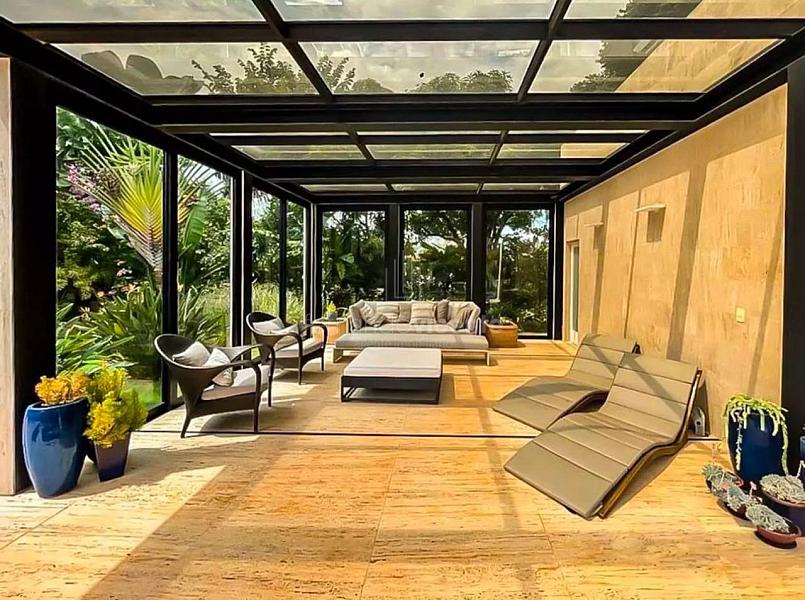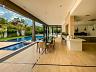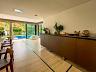 • Espaço gourmet deslumbrante – Com ilha central, fogão elétrico, bancada para refeições rápidas e vista panorâmica para a piscina, separada apenas por portas de vidro.