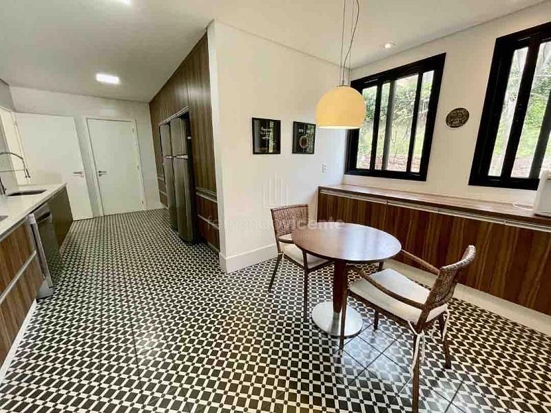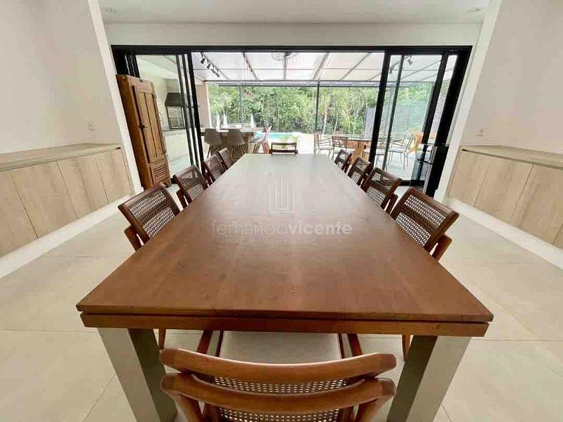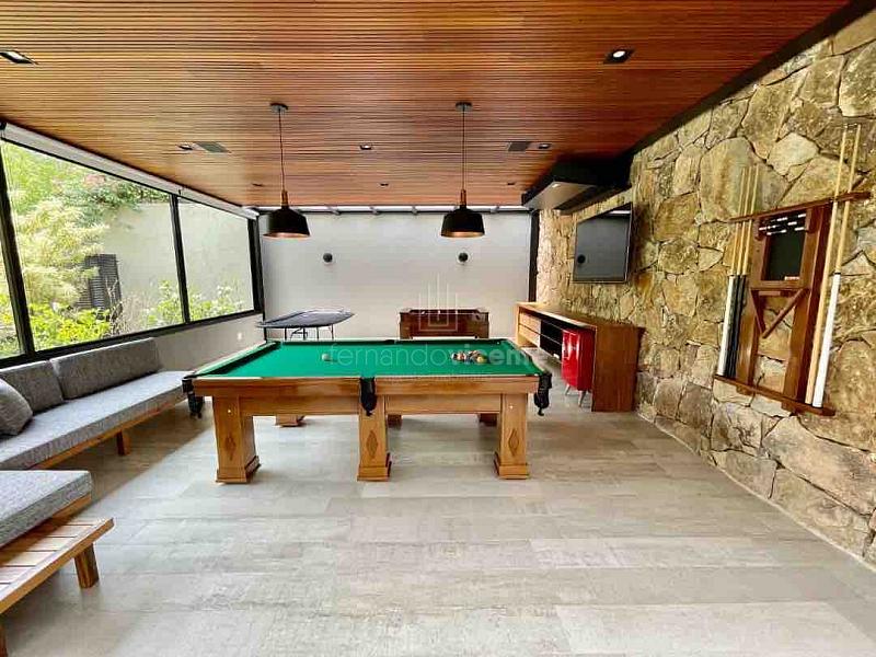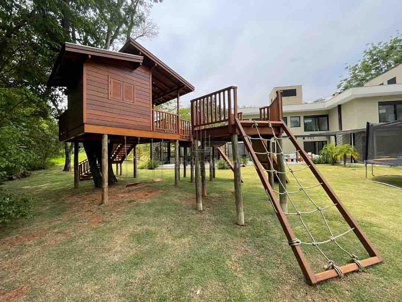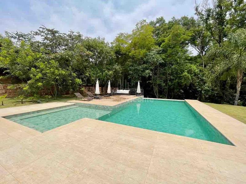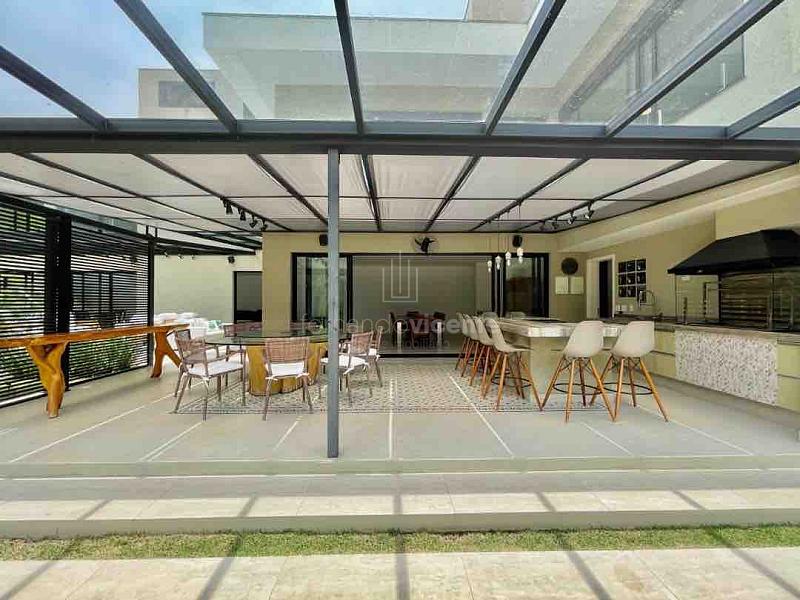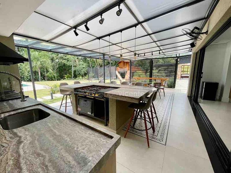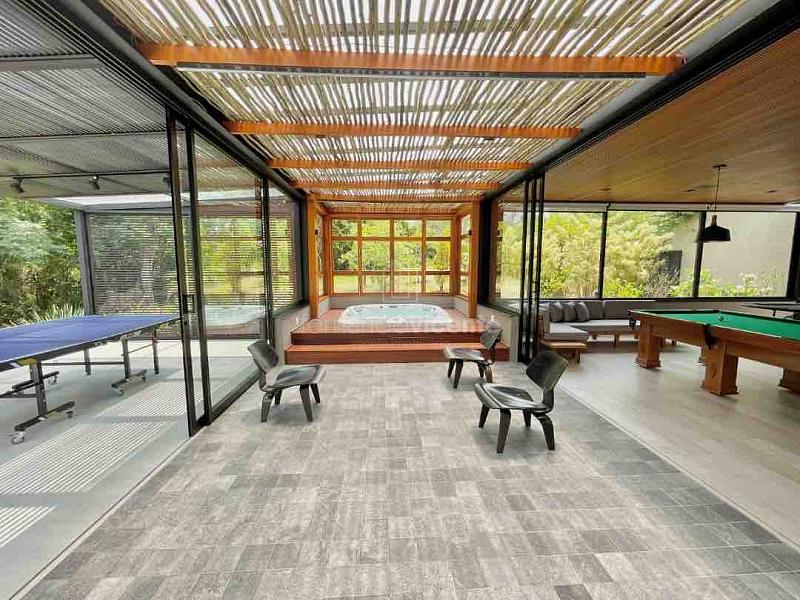 A vista para mata nativa que a área externa desta casa oferece é incrível. E se replica do terraço ensolarada, algo que é incrível. Há ali um espaço gourmet com churrasqueira, piscina e múltiplos espaços para sentar, bater um papo e curtir o clima de natureza.
