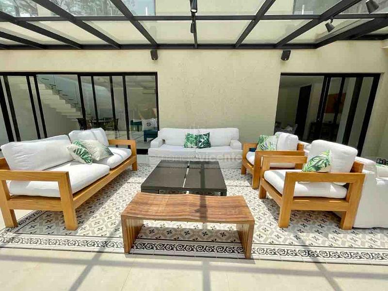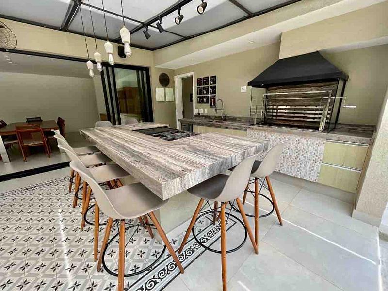 A casa conta com amplas janelas de vidro e toques especiais em aço, criando um ambiente arejado e iluminado. O projeto aproveita ao máximo o terreno em um bairro tranquilo do condomínio. A área social é integrada ao terraço, proporcionando um ambiente perfeito para reunir amigos e familiares. A cozinha, ampla e moderna, está totalmente equipada com eletrodomésticos de última geração.