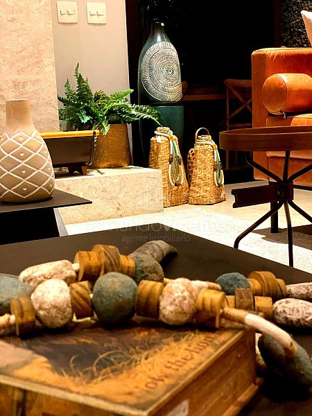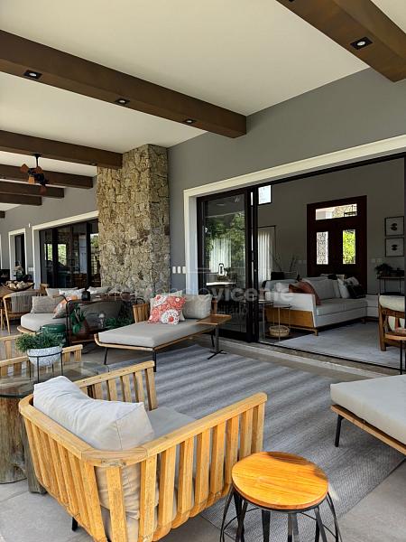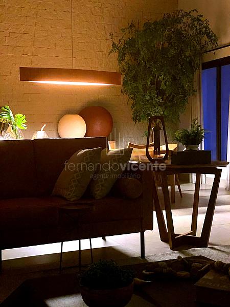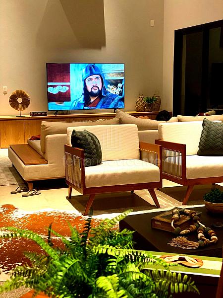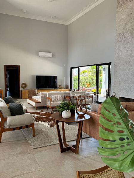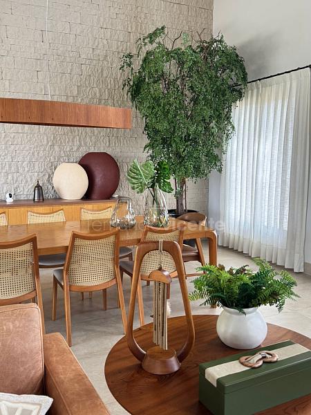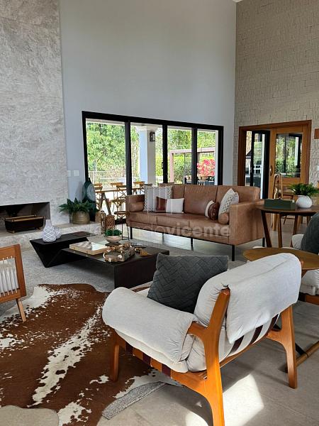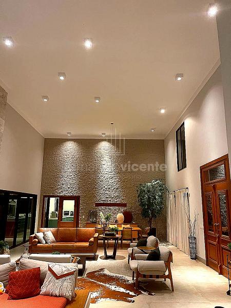 * Ambientes integrados e iluminados: A sala majestosa, com seu pé-direito de 5 metros e uma lareira em mármore travertino, se conecta a todas as áreas sociais. A luz natural invade a casa, criando um ambiente acolhedor e convidativo.