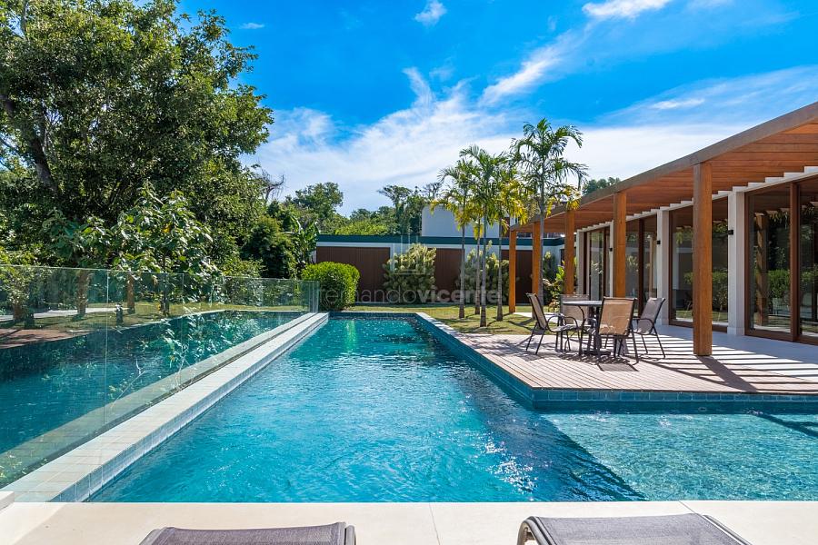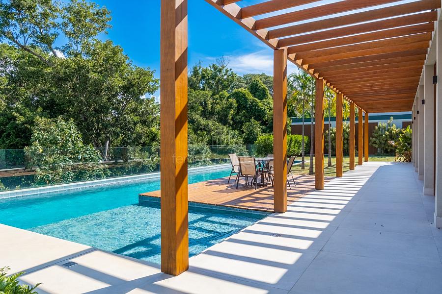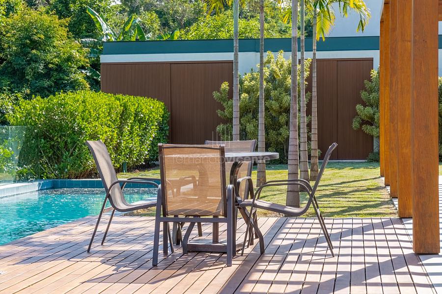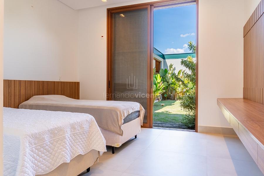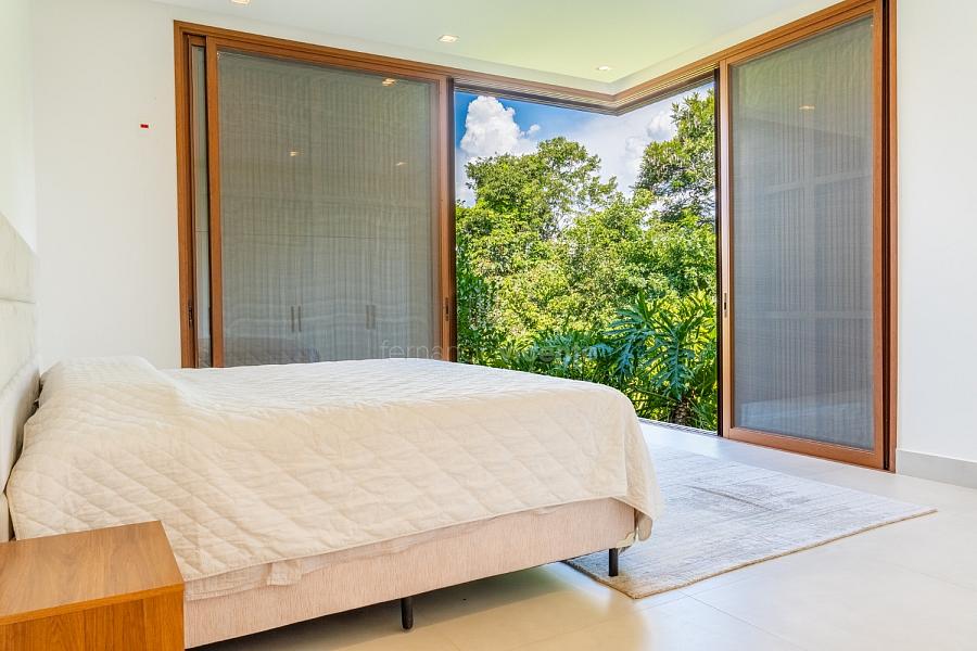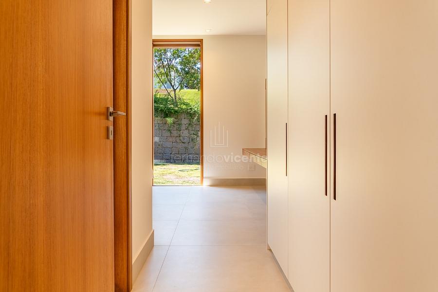 Na área íntima, são 5 dormitórios amplos, todos com armários planejados e ar-condicionado Daikin. Duas suítes voltadas para o jardim e a piscina ampliam a experiência de morar em contato com o verde, com privacidade e tranquilidade.