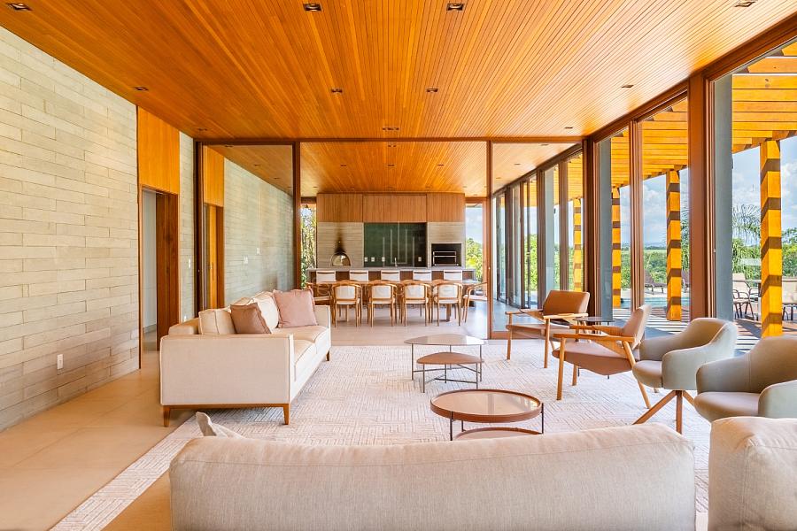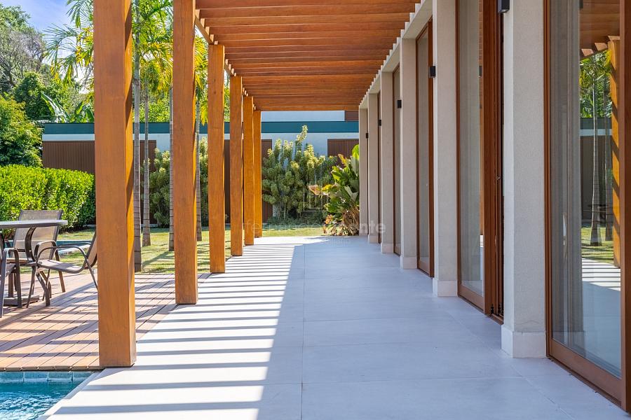 A arquitetura, assinada por Rogério Luciani, foi desenhada para transformar essa paisagem no verdadeiro protagonista. Os ambientes integrados criam continuidade entre living, jantar e área gourmet, permitindo que a luz e o verde acompanhem a rotina com naturalidade. O resultado é uma casa sofisticada e, ao mesmo tempo, acolhedora — feita para viver bem e receber com discrição.