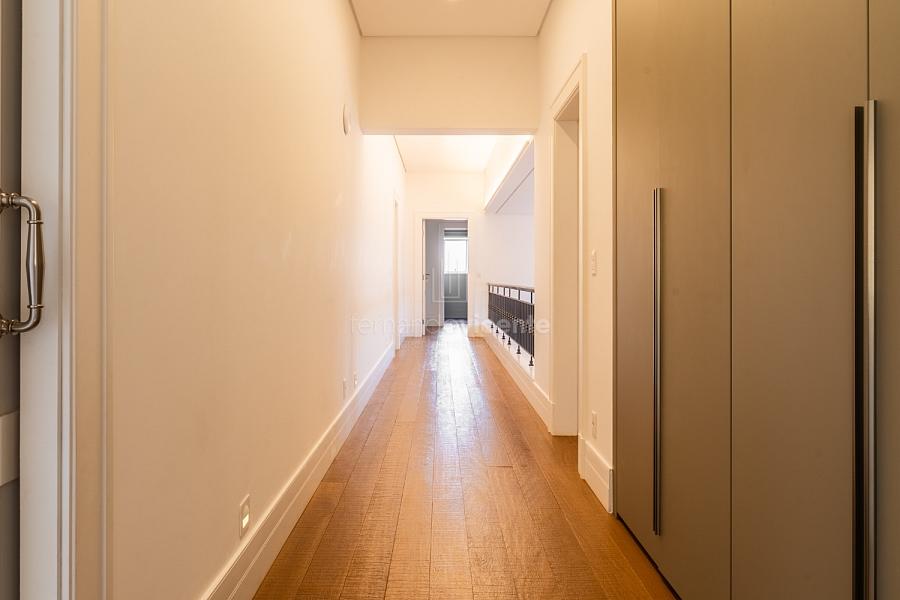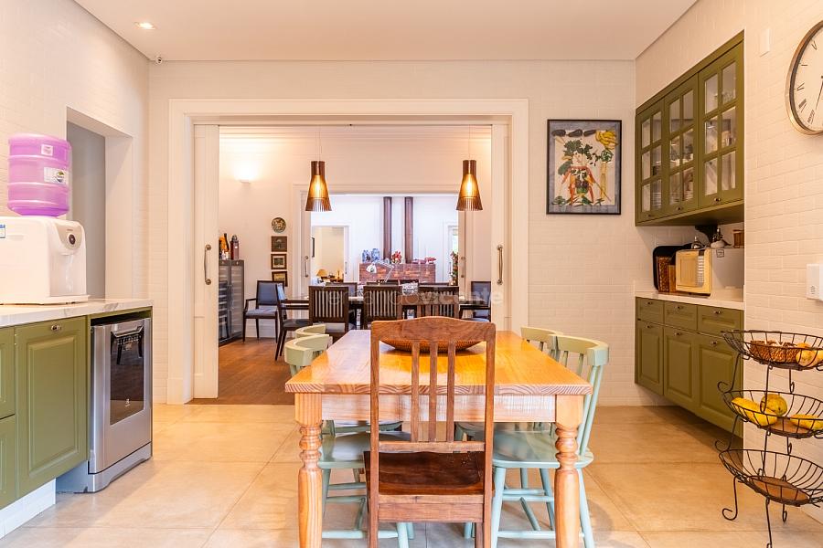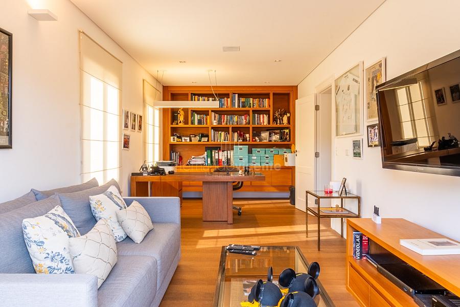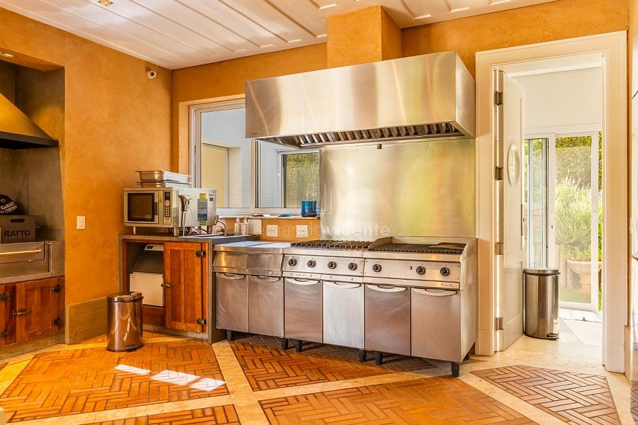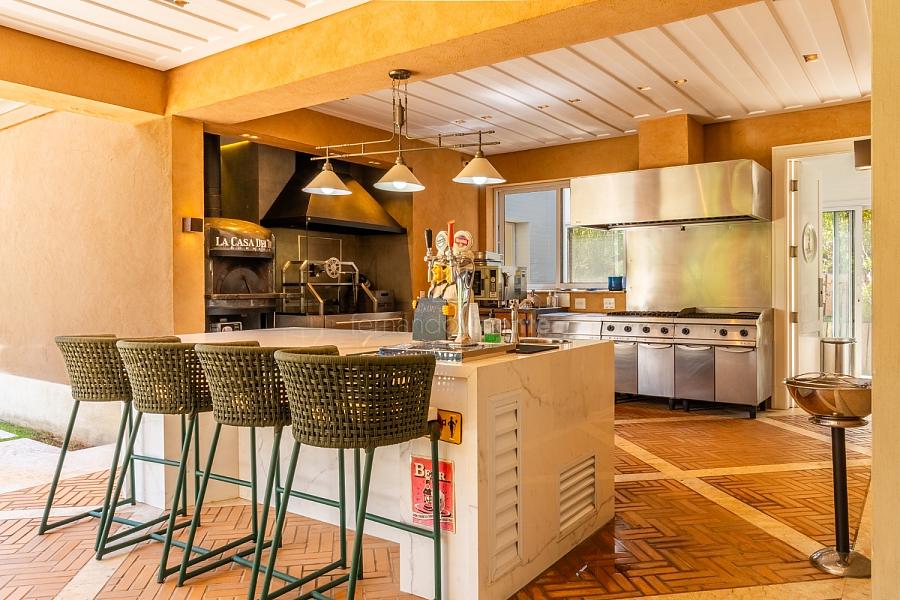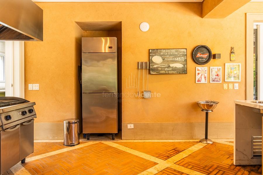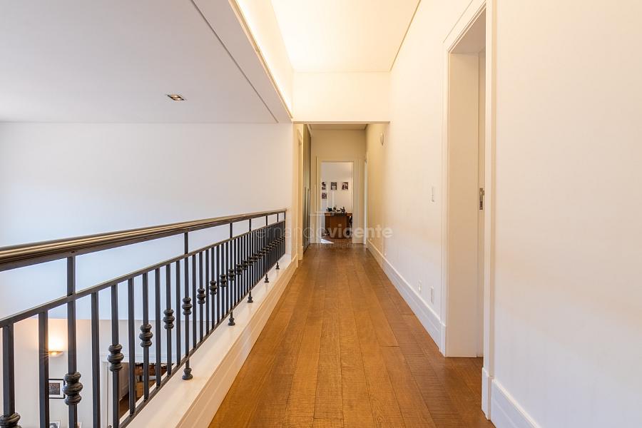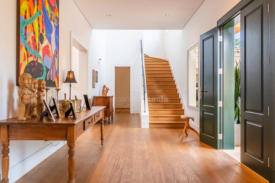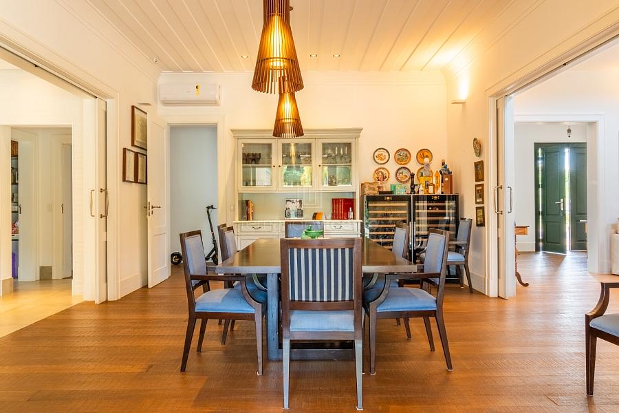 Ao adentrar, a imponência e a luminosidade se revelam no living com pé-direito alto e iluminação natural, um espaço grandioso e acolhedor. Um elegante lavabo, uma aconchegante sala de TV com lareira – perfeita para momentos de introspecção ou convivência familiar –, um escritório inspirador e uma sala de jantar com adega compõem o cenário ideal para a vida social e o deleite gastronômico. A cozinha, equipada para os mais exigentes chefs, é complementada por uma prática área de serviços, garantindo funcionalidade e discrição.