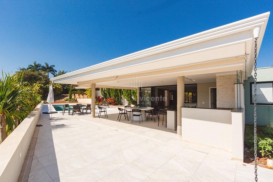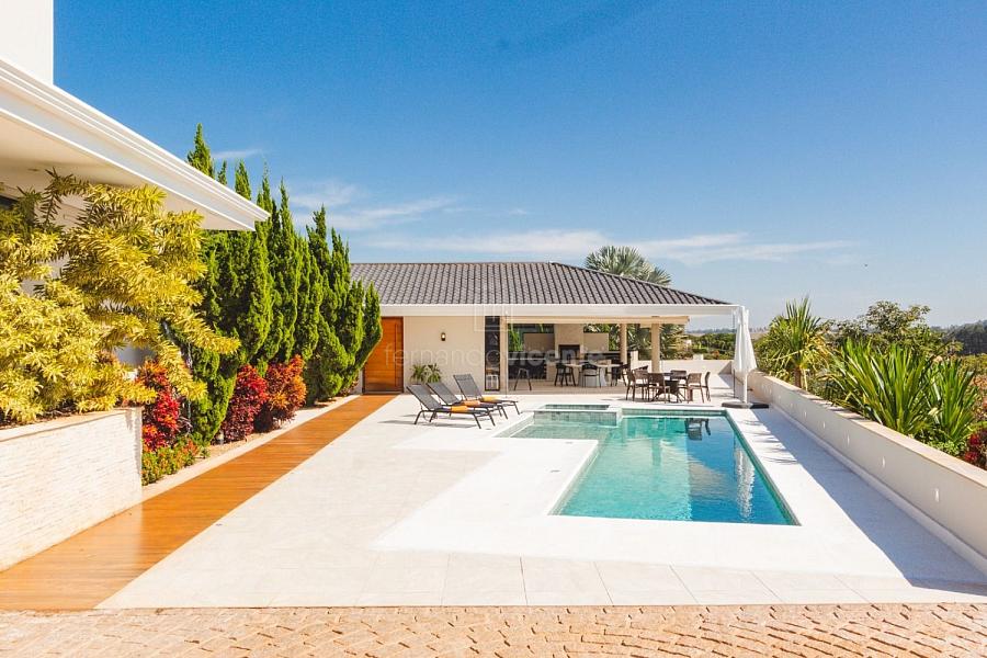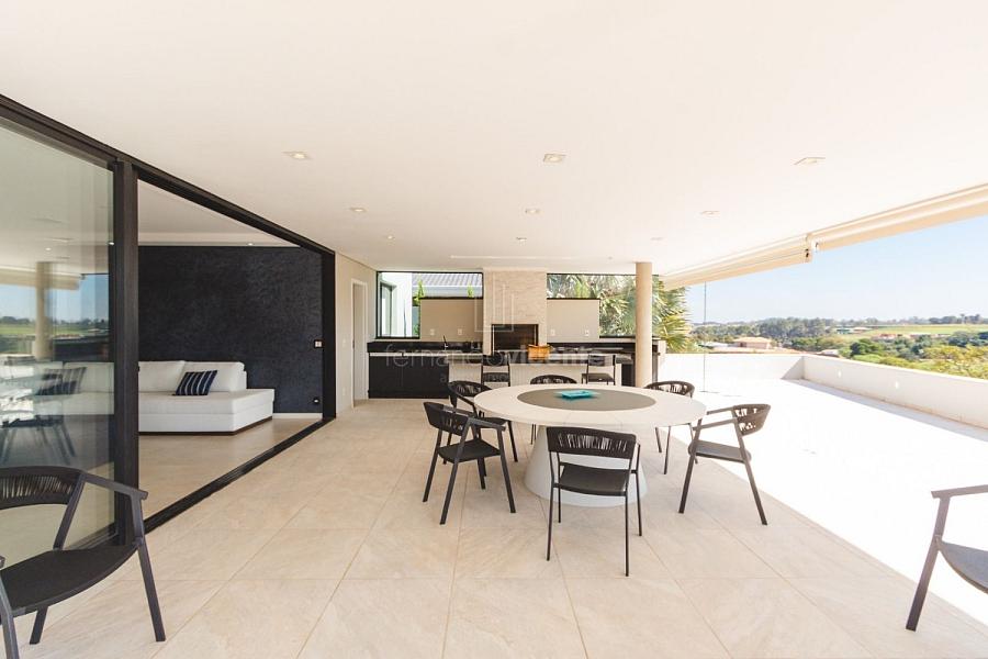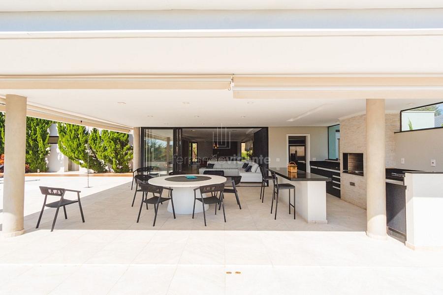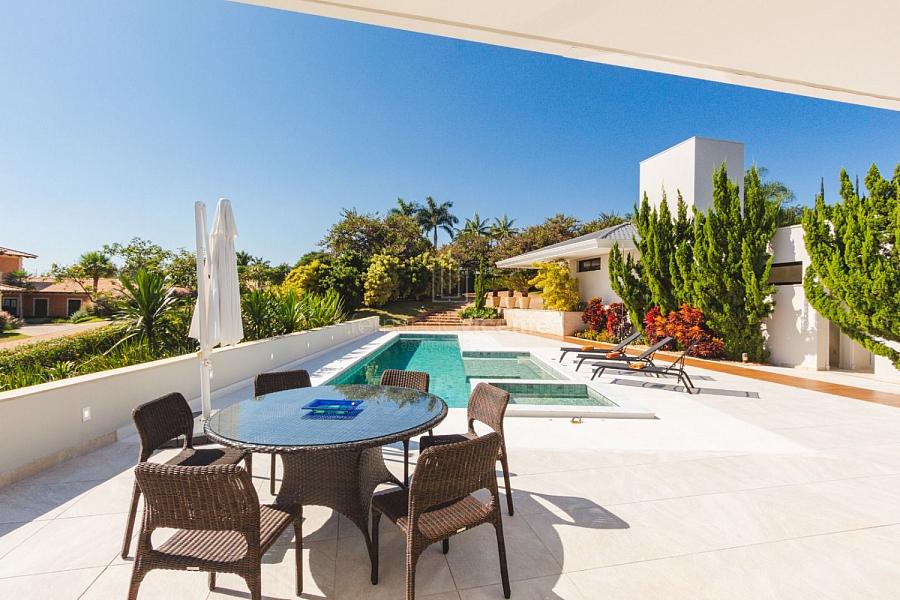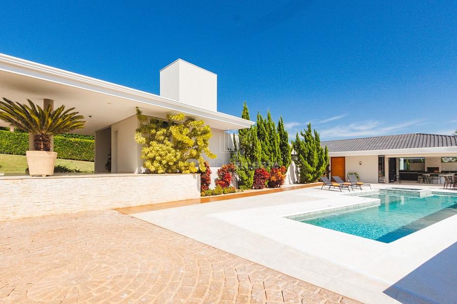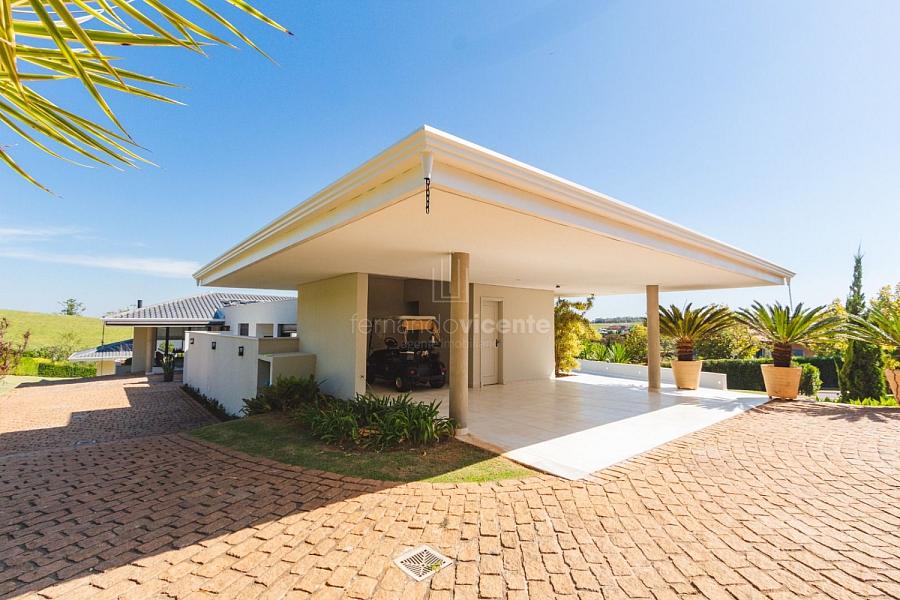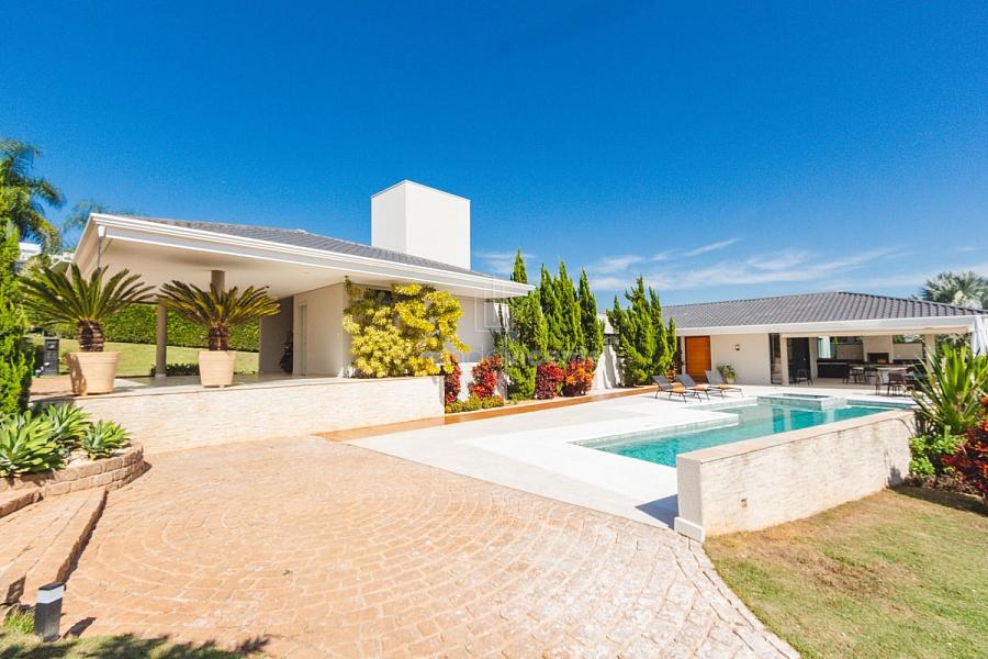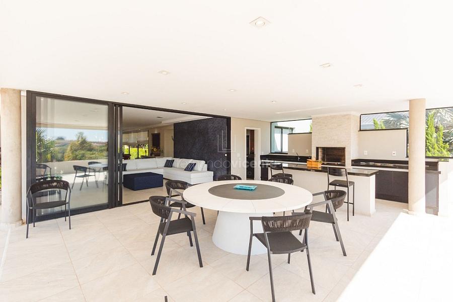 Com um belo projeto de arquitetura voltado para receber amigos e familiares, essa bela casa conta com infraestrutura completa de lazer, tudo com um conforto incrível! Sala ampla e aconchegante com 3 ambientes, integrada à área gourmet e cozinha, a sala ainda conta com lindo jardim de inverno e lareira. Belíssima e espaçosa sala de home theater. São 6 suítes completas, climatizadas, mobiliadas, inclusive com jogo de cama e banho! Área gourmet completa com linda vista para o campo de golfe do condomínio. Piscina aquecida com SPA. Cozinha completa conta com armários de extrema qualidade, fogão e coifas italianos. Acabamentos da casa com mármores e granitos importados. A casa será entregue toda mobiliada, decorada e com todos os itens de cozinha, como talheres, louças, cristais. Toda parte de cama, mesa e banho também estão inclusos. Apartamento de empregados e toda infraestrutura de serviço. Para você que procura praticidade, conforto e segurança, sem dispensar um belo e amplo repertorio de lazer, essa casa é perfeita! Agende uma visita e confira conosco.