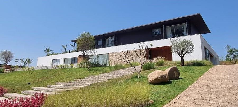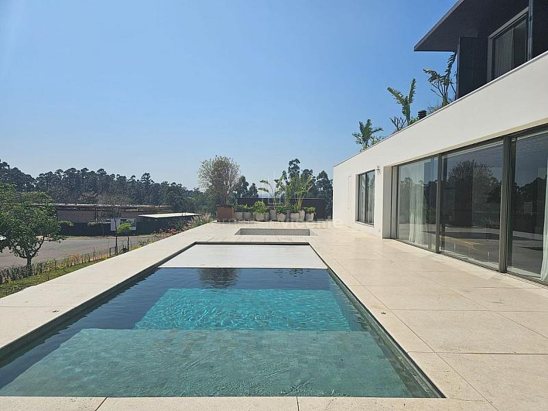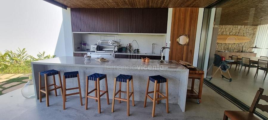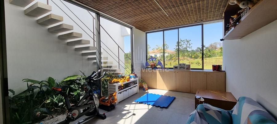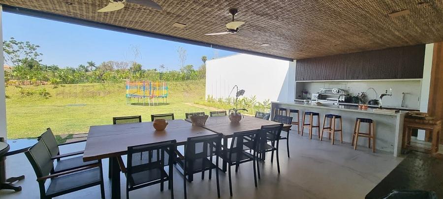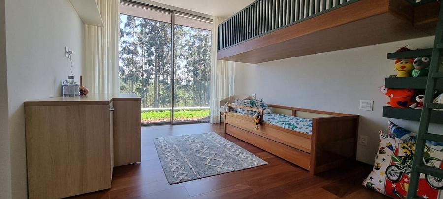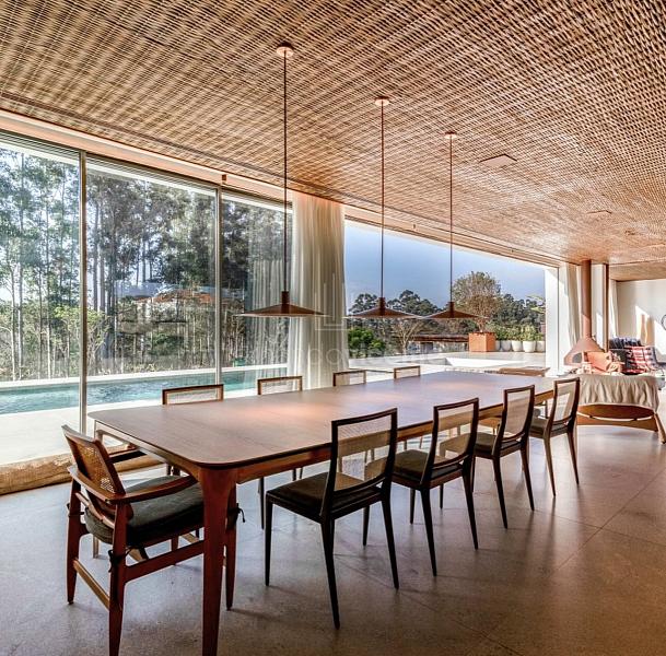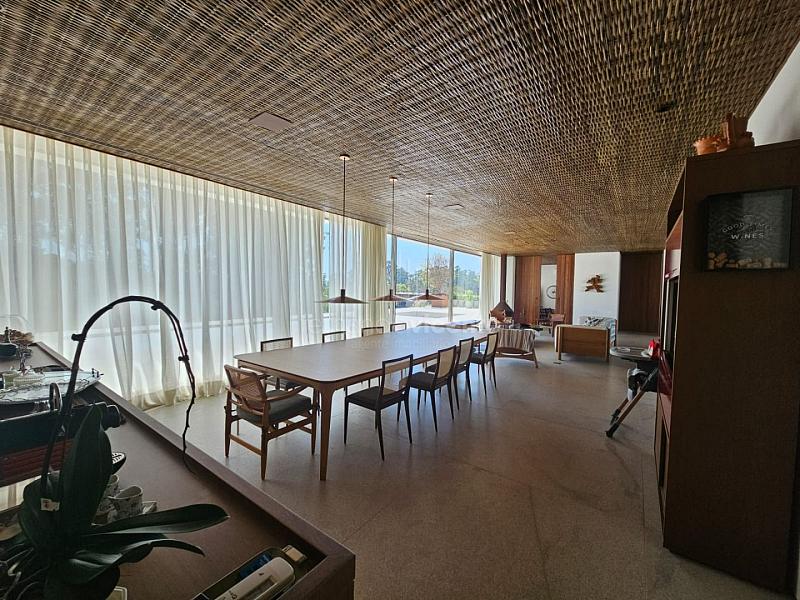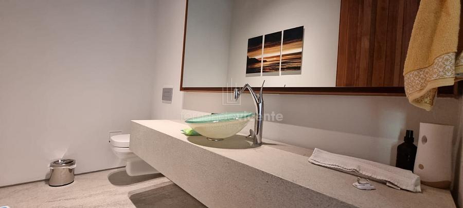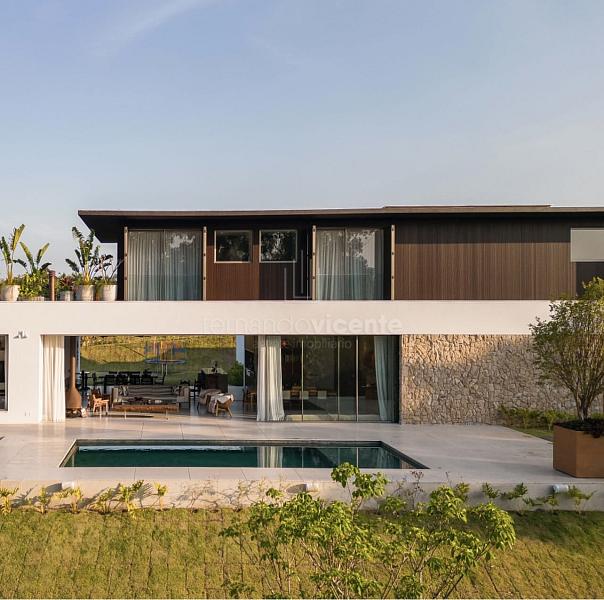 Casa nova com vista permanente, projeto assinado por Gabriel Garbin, iluminação natural abundante, paisagismo MB Flores, árvores frutíferas e horta. Apresenta living amplo, sala de estar e jantar com lareira 360° Construflama, área gourmet e escritório, além de luz e persianas com automação. Os ambientes são integrados, com forro diferenciado em tramas de vime e dispõe de varanda com vista para a área de lazer. A cozinha e a área de serviço têm armários planejados. Na parte íntima há cinco suítes, sendo duas no térreo e três no andar superior. A suíte master é espaçosa, dispõe de walk-in closet e piso em tábuas de cumaru. A área gourmet é equipada com parrilla Construflama, ice maker e beer center Elettromec, adega Art des Caves e chopeira Stambeer. Há ainda piscina com vista para área verde, água com aquecimento solar, placas fotovoltaicas, captação de água de chuva para irrigação do jardim, poço artesiano e gerador a gás MWM, além de casa de caseiro com dois quartos climatizados, banheiro, sala e cozinha. A casa dispõe de oito vagas de garagem. Para você que procura um condômino de alto padrão com campo de Golf e um linda praia, esta eh a oportunidade.