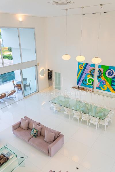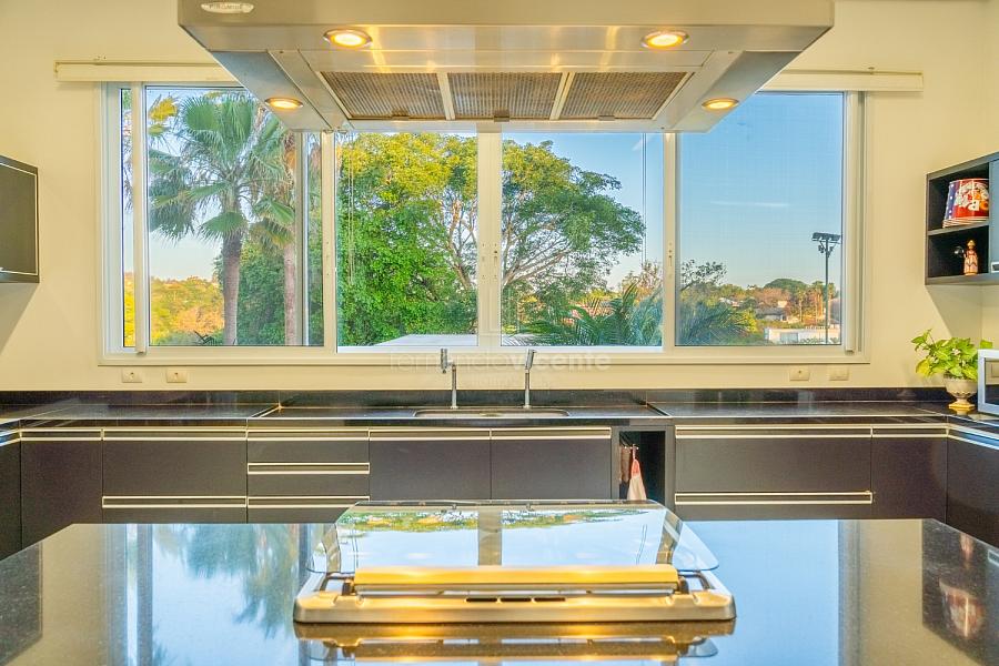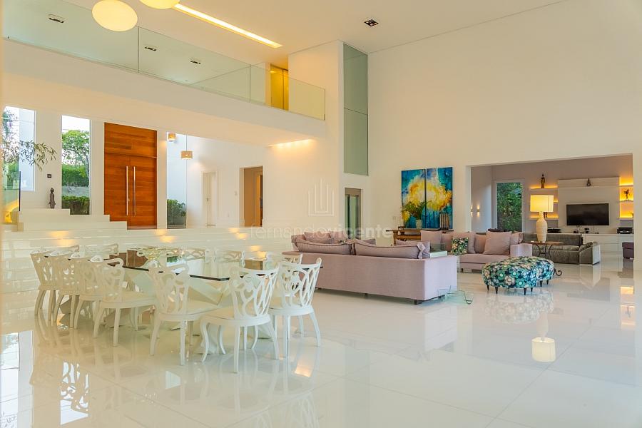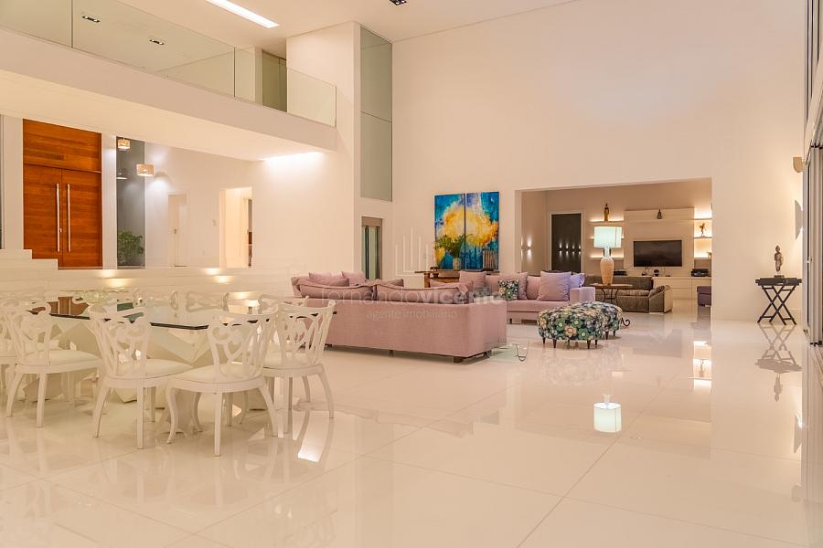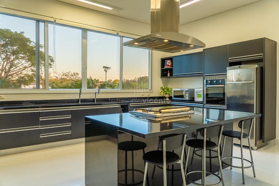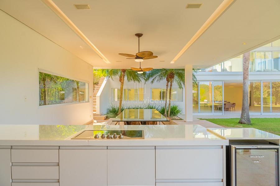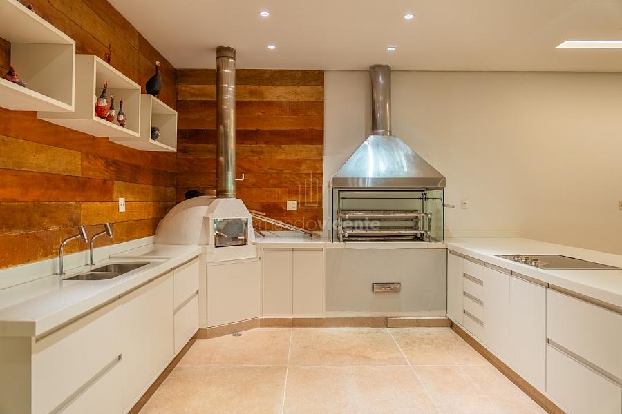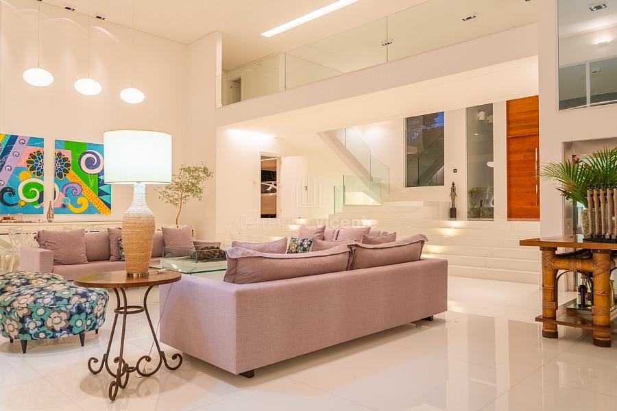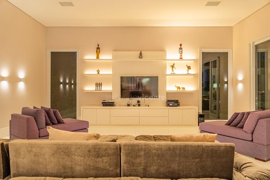 O living amplo com pé-direito alto cria um cenário dramático e acolhedor, fluindo para o lavabo elegante e o home theater equipado, ideal para noites de cinema privativo. A cozinha completa com ilha central e área de serviços dedicada facilita o dia a dia, enquanto a varanda gourmet com cozinha de apoiotransforma refeições em eventos memoráveis ao ar livre.
