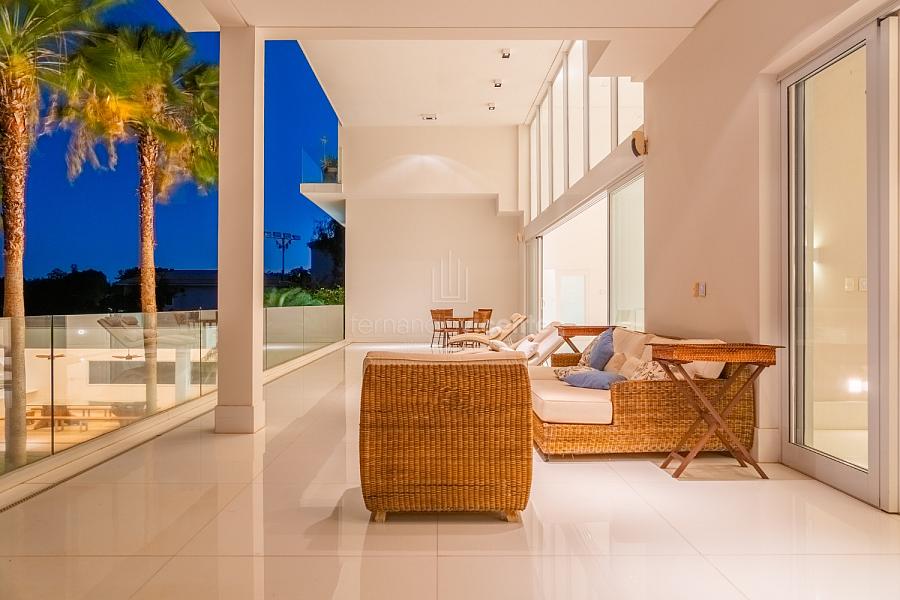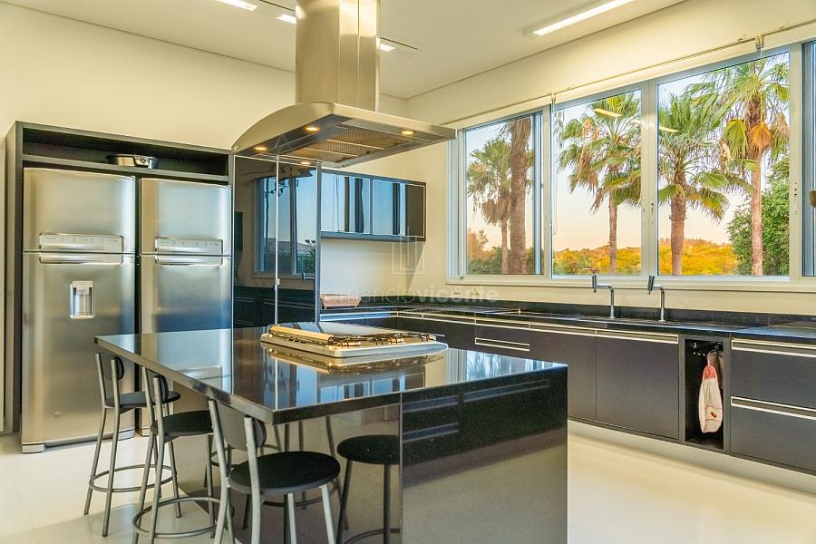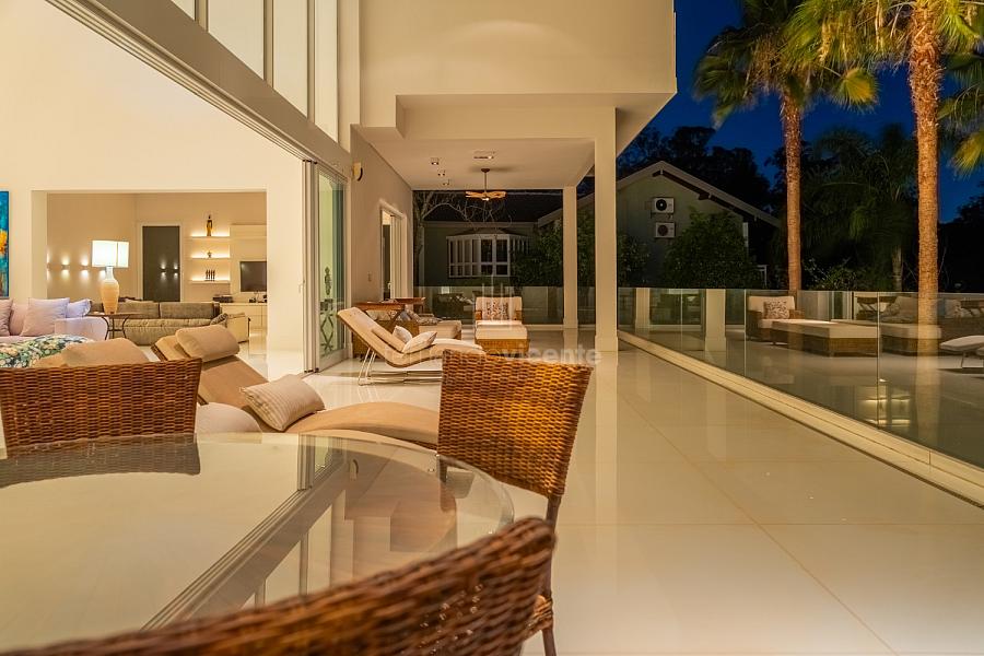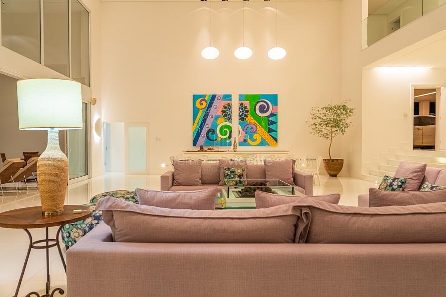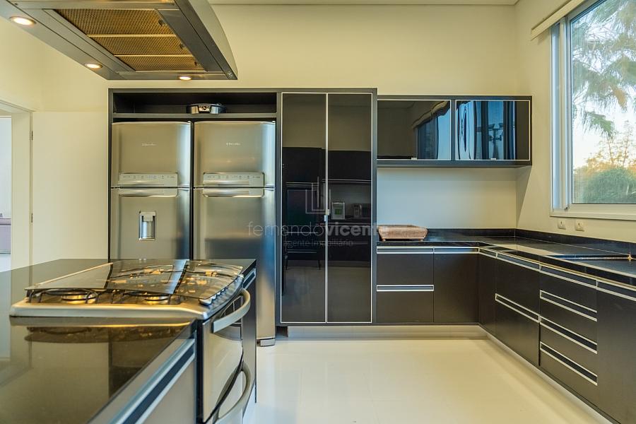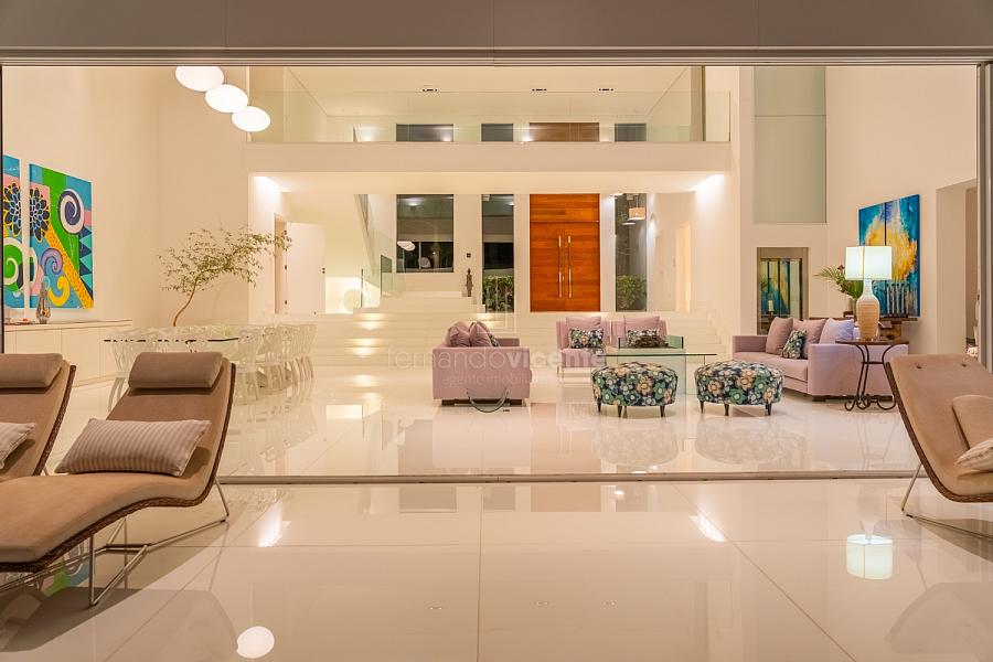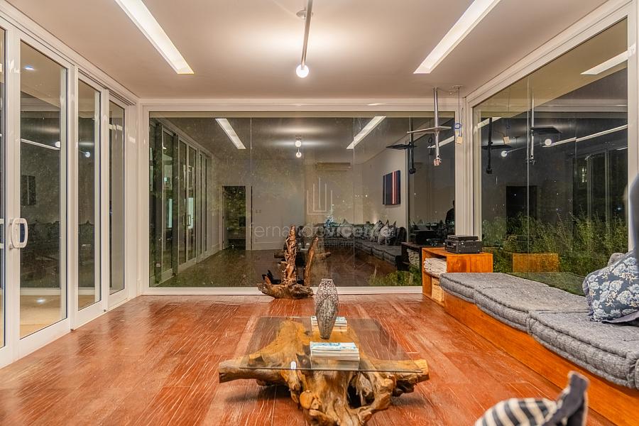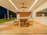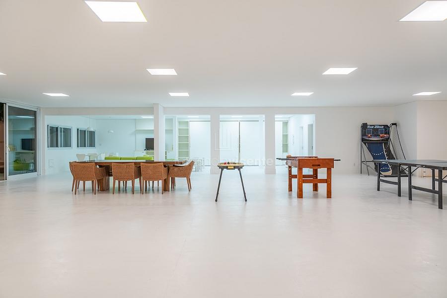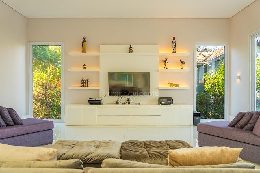 O living amplo com pé-direito alto cria um cenário dramático e acolhedor, fluindo para o lavabo elegante e o home theater equipado, ideal para noites de cinema privativo. A cozinha completa com ilha central e área de serviços dedicada facilita o dia a dia, enquanto a varanda gourmet com cozinha de apoiotransforma refeições em eventos memoráveis ao ar livre.