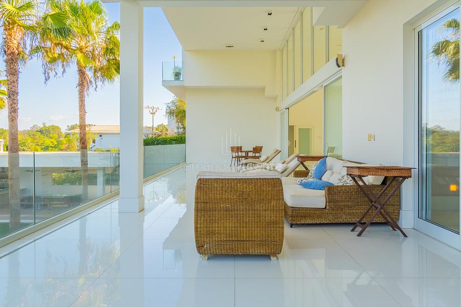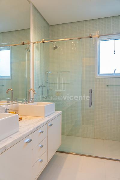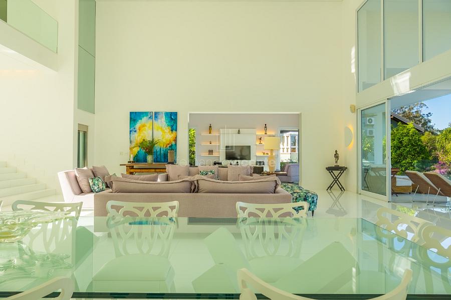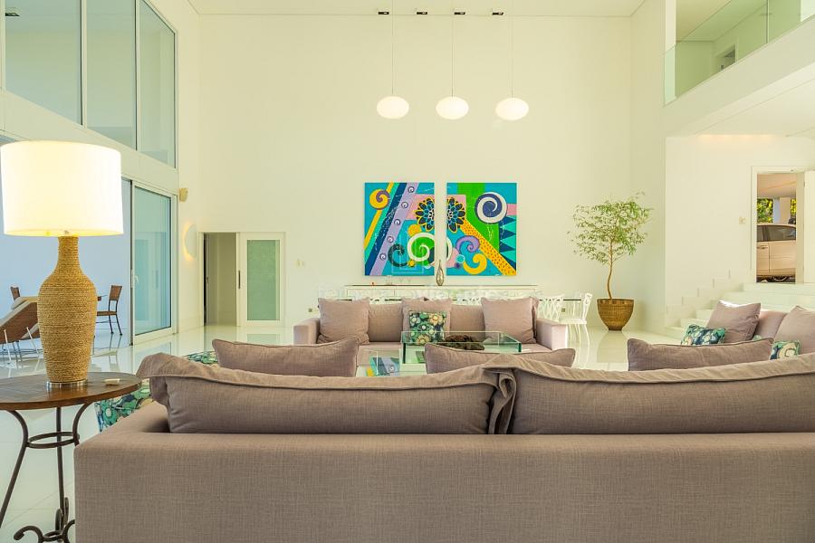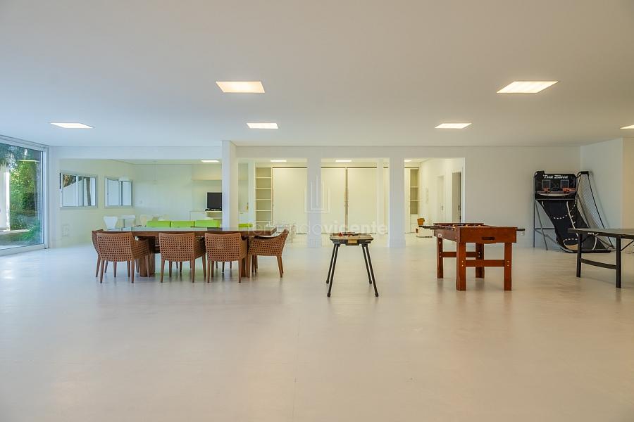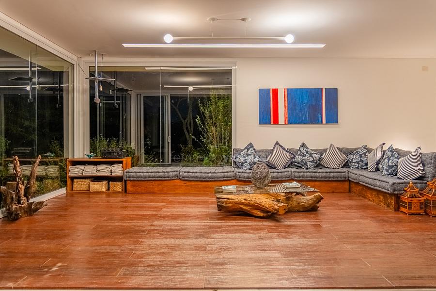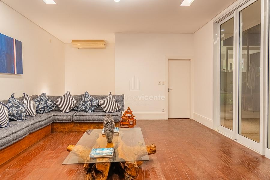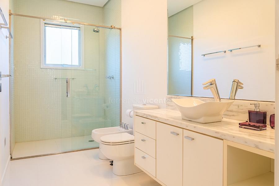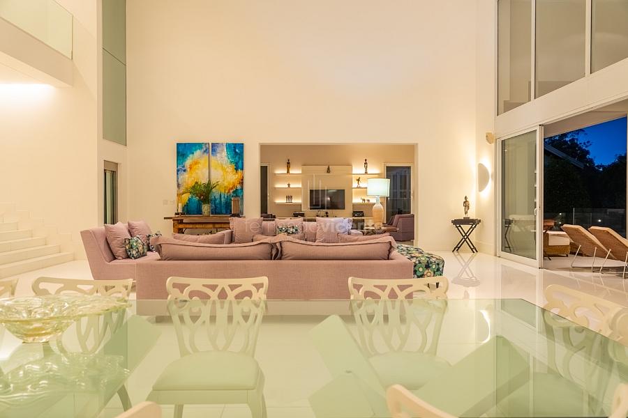 O living amplo com pé-direito alto cria um cenário dramático e acolhedor, fluindo para o lavabo elegante e o home theater equipado, ideal para noites de cinema privativo. A cozinha completa com ilha central e área de serviços dedicada facilita o dia a dia, enquanto a varanda gourmet com cozinha de apoiotransforma refeições em eventos memoráveis ao ar livre.