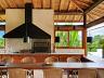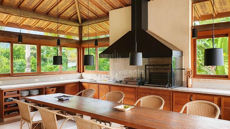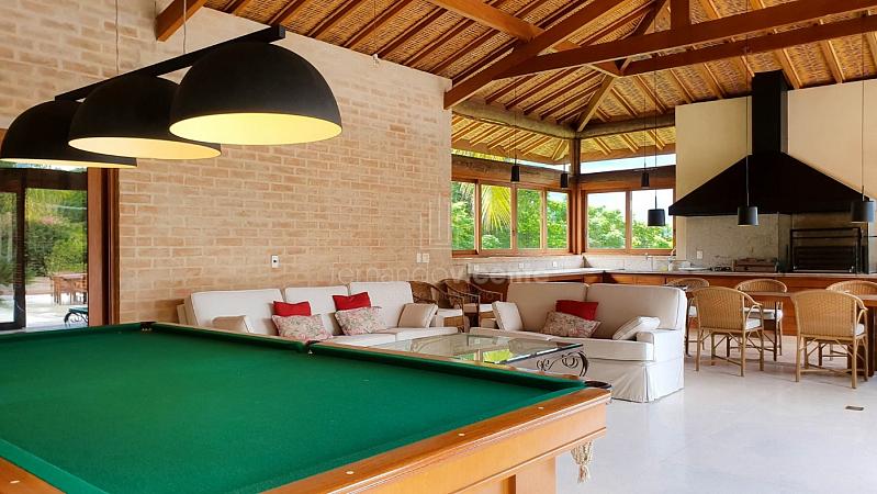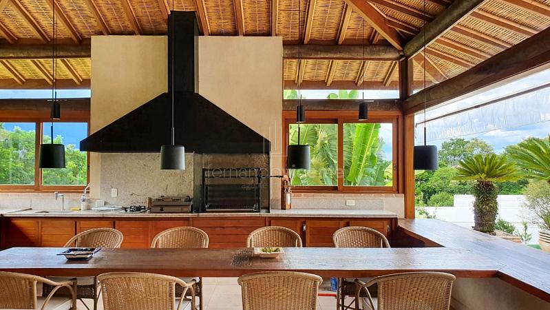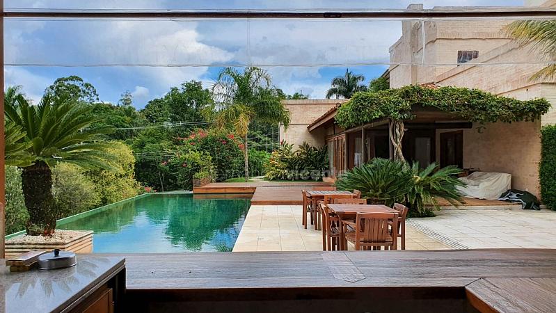 Quando chegamos no espaço gourmet que foi pensado em receber convidados da melhor forma que se pode imaginar, ampla área de churrasco com um lindo balcão em madeira de lei, um estar para convivência, mesa de bilhar, sala de TV, tudo isso com o privilégio de uma linda vista e um visual inesquecível da piscina da casa e de toda natureza ao redor.