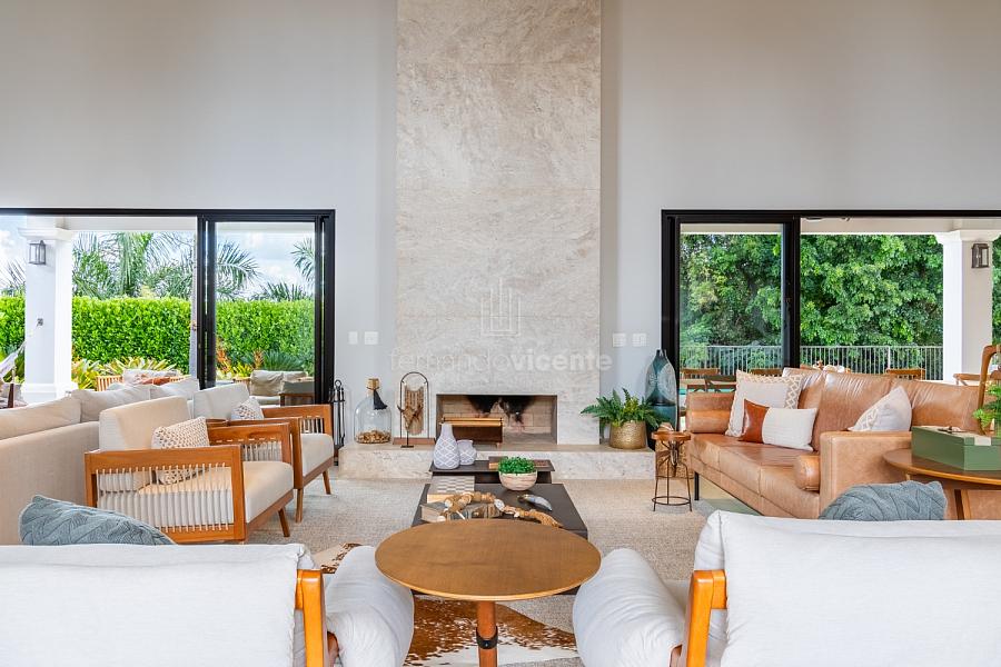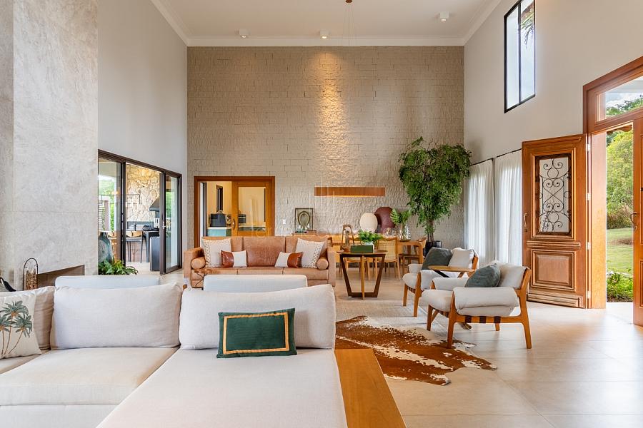 A chegada revela um living marcante, com pé-direito de 5 metros e lareira em mármore travertino, onde a luz e a amplitude ditam o ritmo da casa. A área social foi pensada para viver bem: ambientes integrados que se conectam naturalmente à cozinha e à varanda gourmet, formando o cenário ideal para receber com charme e fluidez.