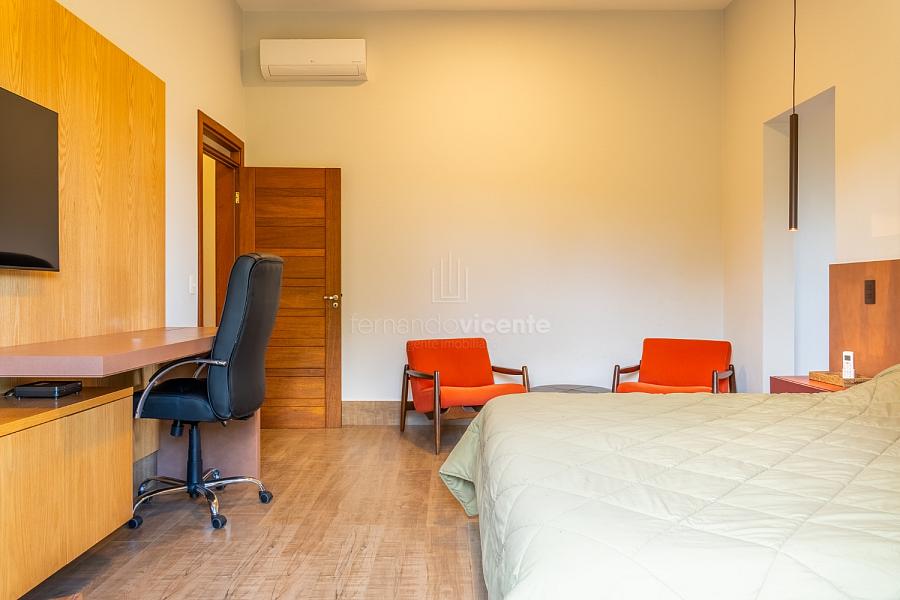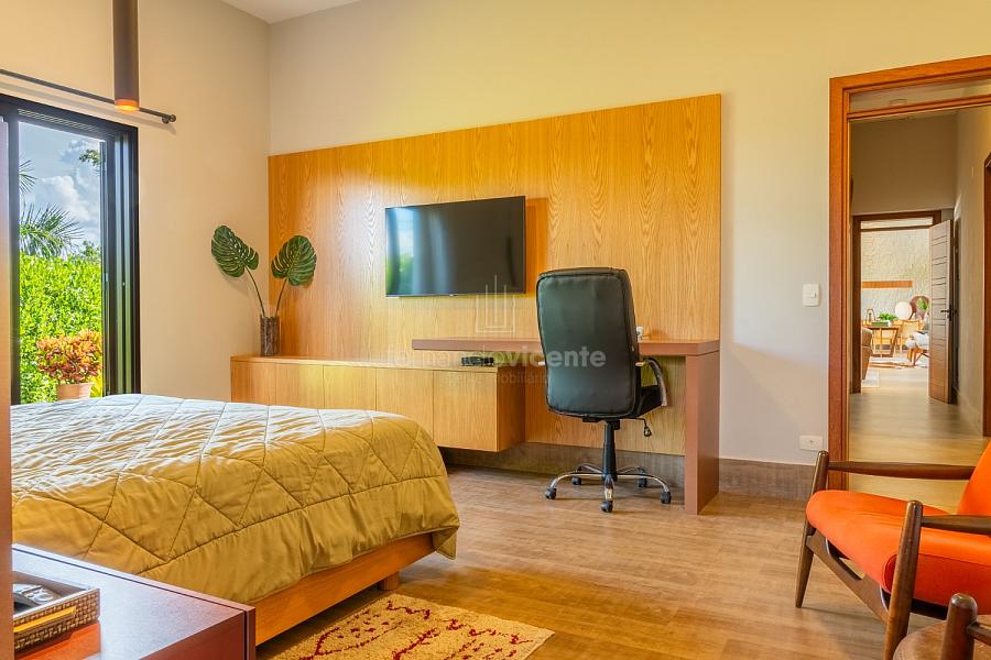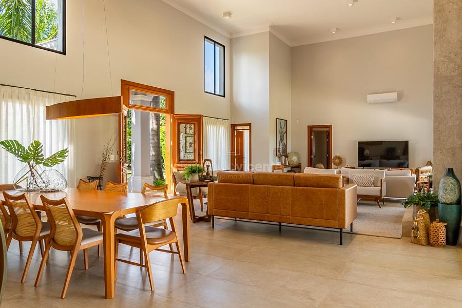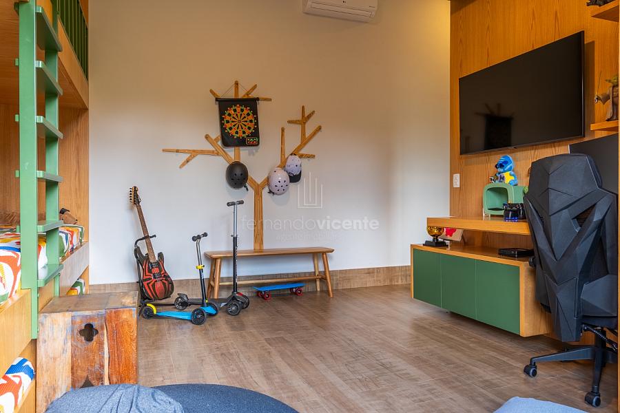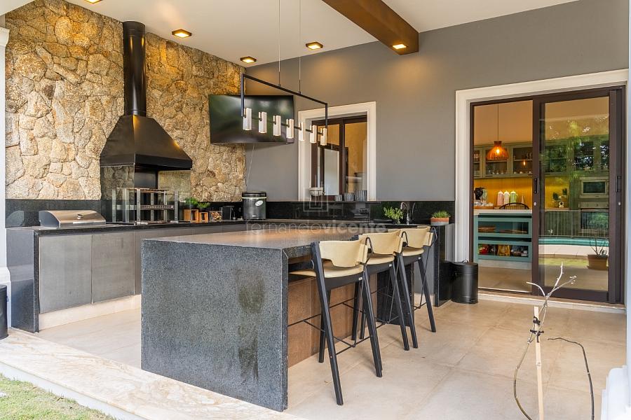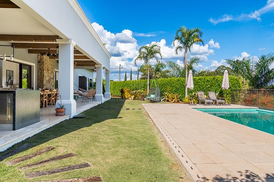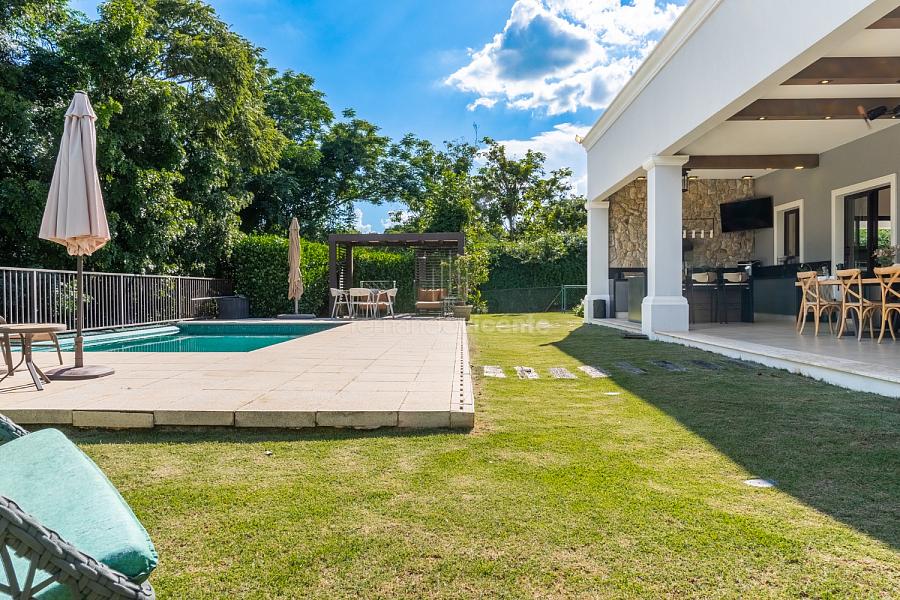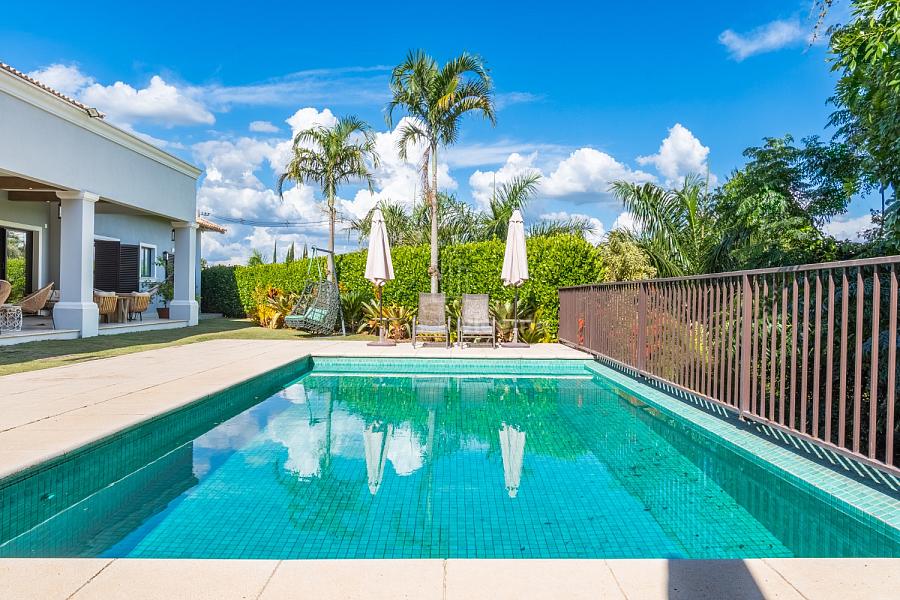 Do lado de fora, o lazer acompanha o mesmo nível de cuidado: piscina de 30 m², deck e paisagismo, além de uma gourmet equipada com churrasqueiras e ilha refrigerada de 1.000L — tudo integrado, pronto para momentos memoráveis. A casa ainda traz soluções que valorizam o dia a dia, como aquecimento solar, infraestrutura planejada e garagem coberta para 4 veículos.