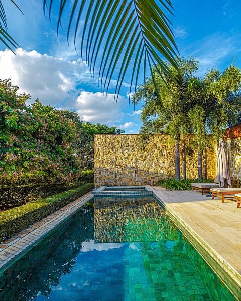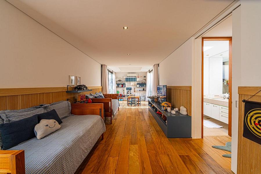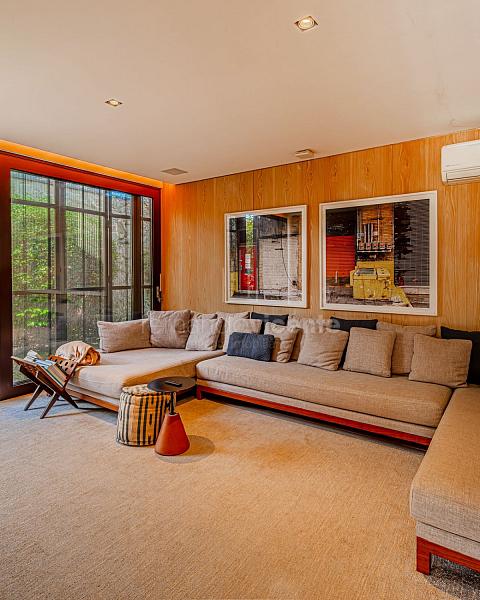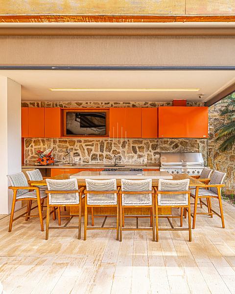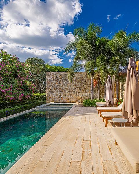 São 650 m² de área construída, cuidadosamente planejados para integrar conforto e elegância. Os espaços sociais — salas de estar, jantar e área gourmet completa — trazem acabamentos nobres em pedra e madeira, com uma sala externa que se conecta harmoniosamente à piscina, criando um ambiente perfeito para receber.