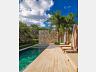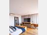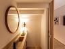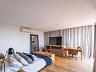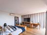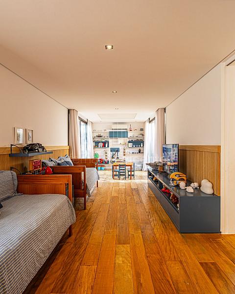 Os pisos em cimento queimado e madeira maciça reforçam a sensação de conforto e sofisticação em cada detalhe.