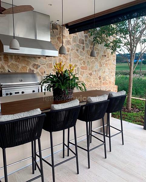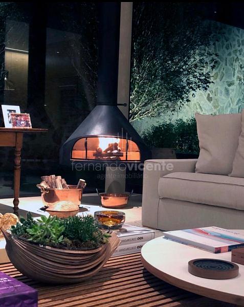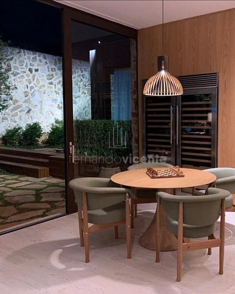 A casa oferece 5 suítes, com destaque para a suíte master no pavimento superior, que inclui varanda privativa e escritório. Os ambientes sociais incluem 3 salas — estar, jantar e TV — além de espaço gourmet completo, piscina de borda infinita e fire pit, criando o cenário ideal para receber amigos e familiares.