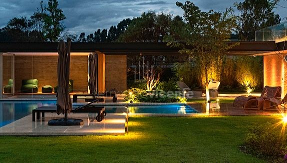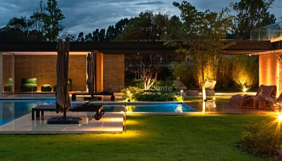 Projetado com uma vista privilegiada para o campo de golfe na divisa posterior do lote, o corpo principal da residência foi estrategicamente posicionado o mais próximo possível desse cenário, permitindo a contemplação dos campos e aproveitando a generosa distância dos vizinhos. Composto por áreas sociais no pavimento térreo e suítes no andar superior, esse volume central cria dois amplos espaços livres. Na frente, um jardim de entrada exuberante, com um percurso entre árvores e vegetações de pequeno e médio porte, oferece um espaço de transição e contemplação. Já nos fundos, um espaço livre mais versátil, com menos paisagismo, possibilita diversas funções, trazendo dinamismo ao uso cotidiano.