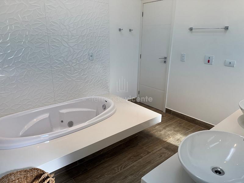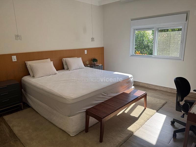 O living com pé-direito alto e lareira integrada é um convite ao relaxamento. A casa conta com quatro suítes impecáveis, todas equipadas com persianas automatizadas. A suíte master é um verdadeiro refúgio, com closet e hidromassagem. A segunda suíte possui armários, e a quarta suíte conta com um quarto acoplado que pode ser transformado em home office ou closet.