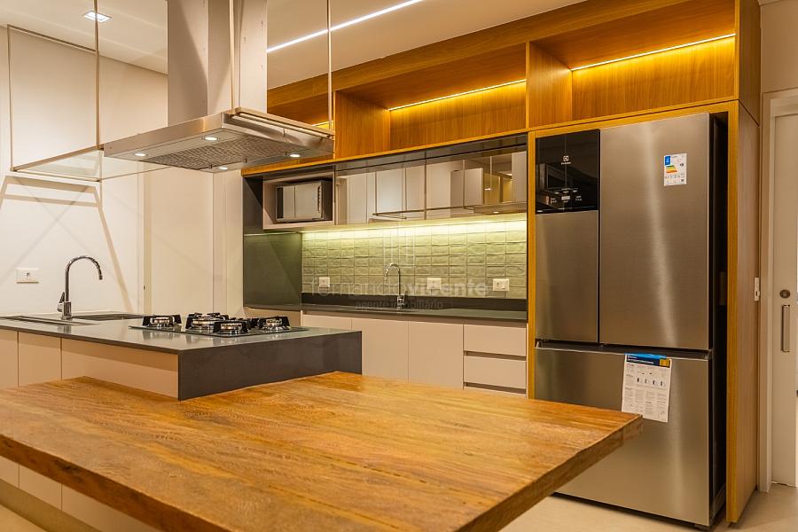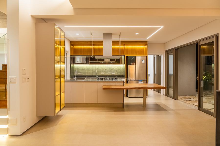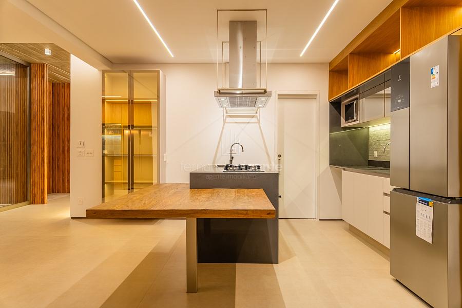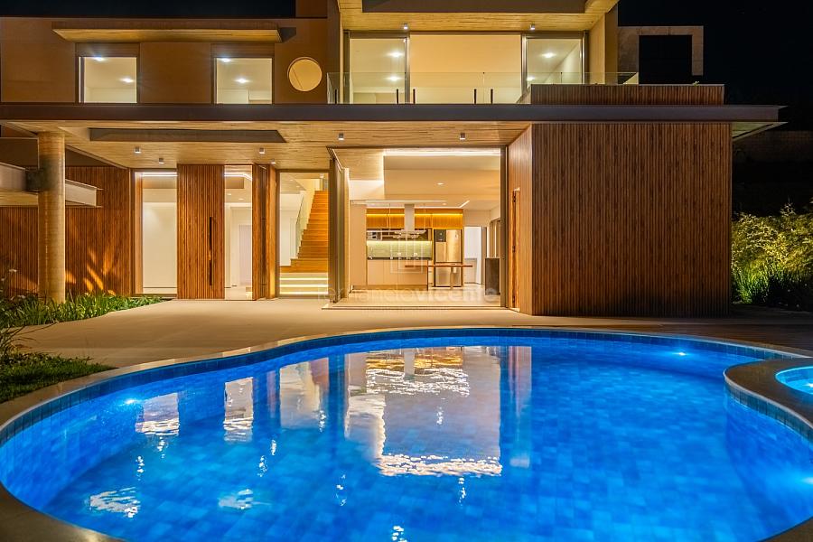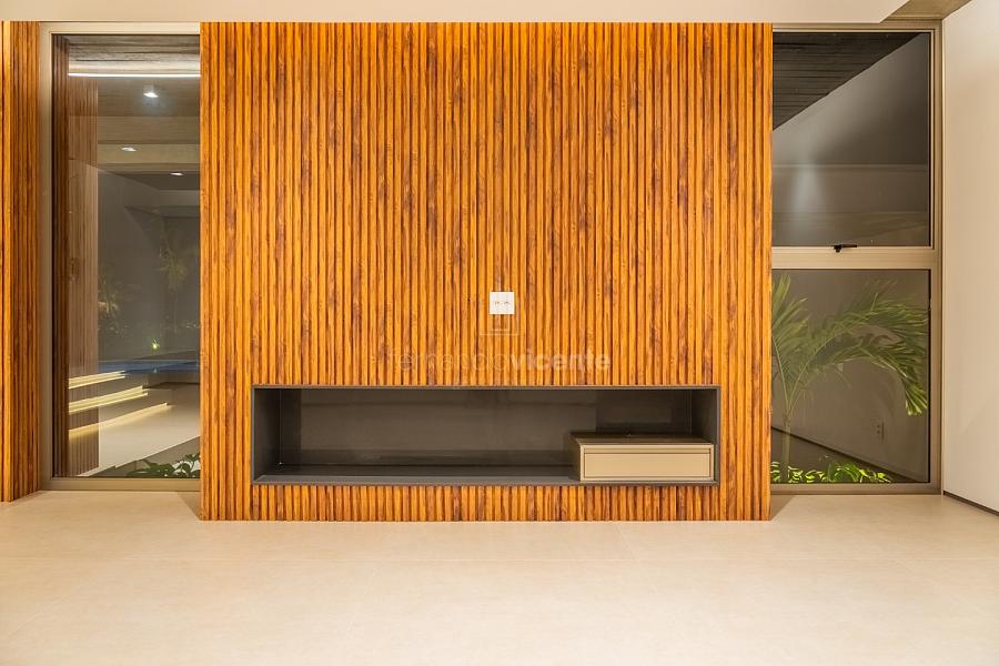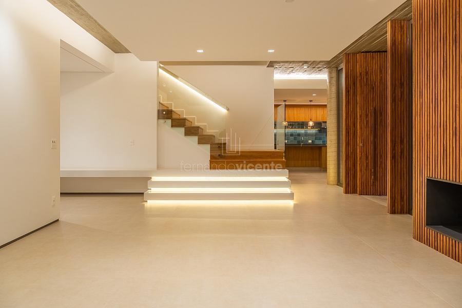 Ambientes generosos banhados por luz natural priorizam conforto máximo. A área social impressiona com living de pé-direito duplo e lareira contemporânea embutida, ideal para noites acolhedoras. A cozinha gourmet, com ilha em madeira e bancadas em pedra, flui para a varanda externa, fomentando convívios e celebrações. Nos andares superiores, quartos com piso em madeira e acabamentos nobres levam à suíte master spa privativa: closet amplo, varanda privativa e banheiro spa com banheira orgânica, iluminação embutida e revestimentos texturizados premium – um oásis de bem-estar diário.