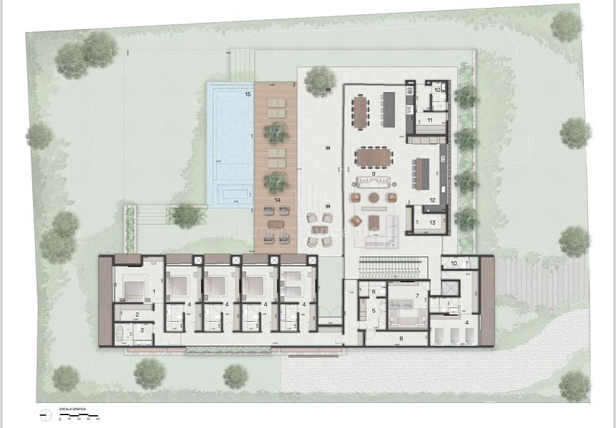 No pavimento térreo, a residência é estrategicamente dividida em dois blocos: social e privativo. No bloco social, temos sala de estar, sala de jantar, espaço gourmet, adega e sauna, todos integrados à área externa, proporcionando uma harmonia entre o interior e o deck com piscina aquecida e SPA. A cozinha com despensa complementa o ambiente, unindo funcionalidade e sofisticação.