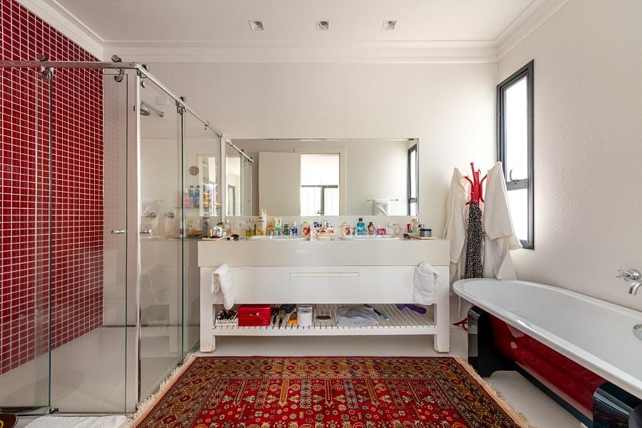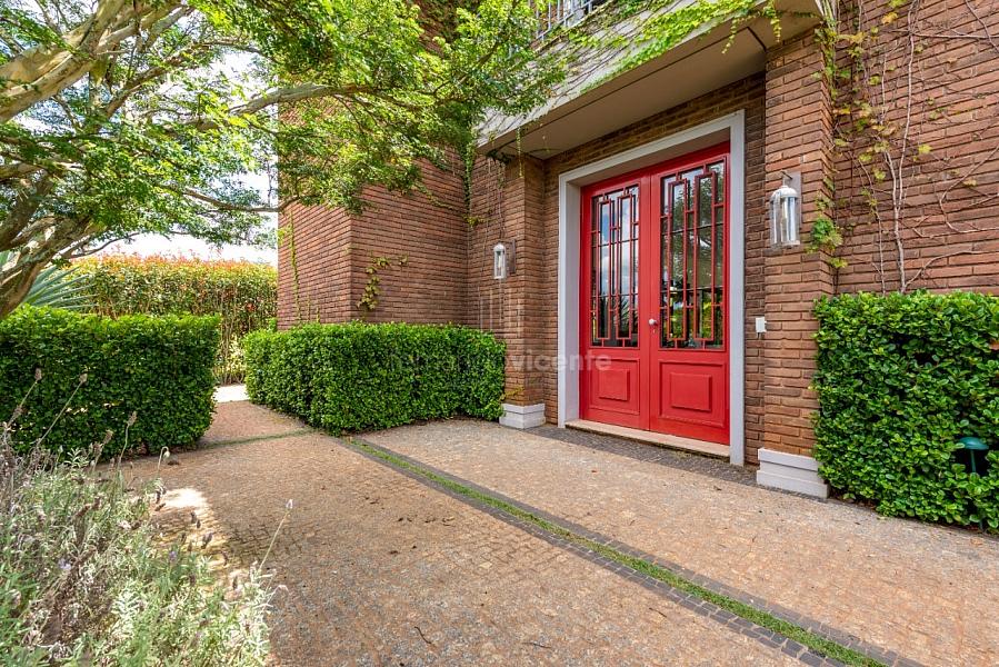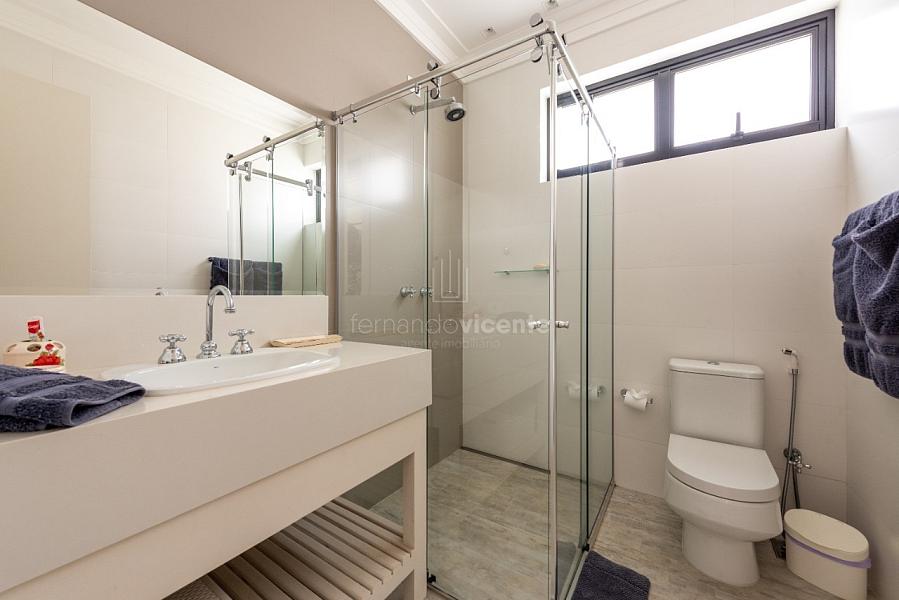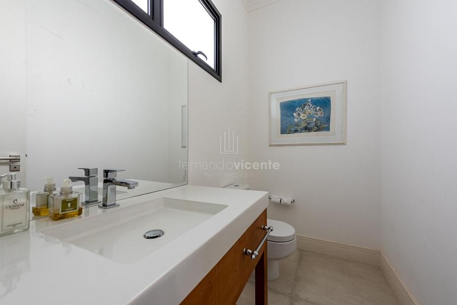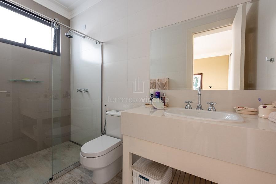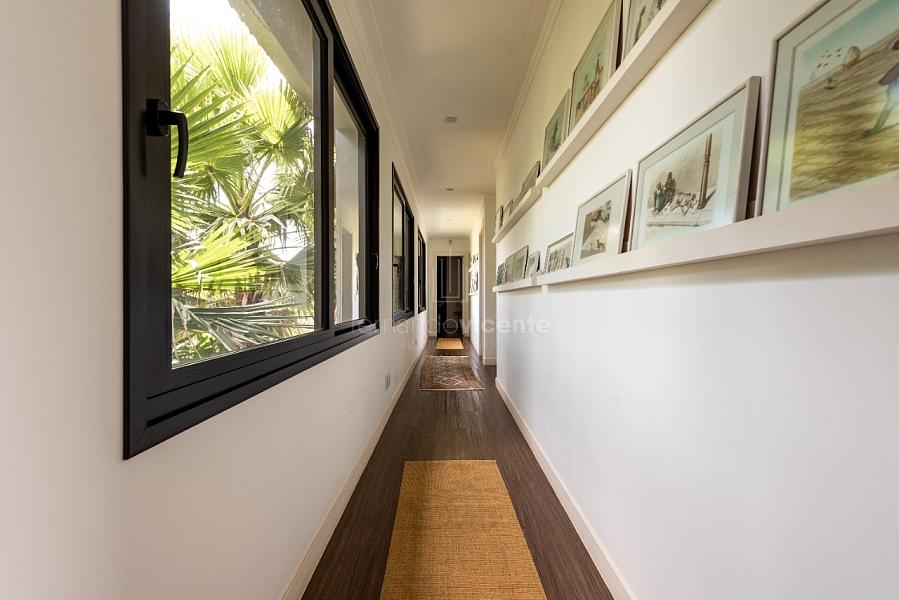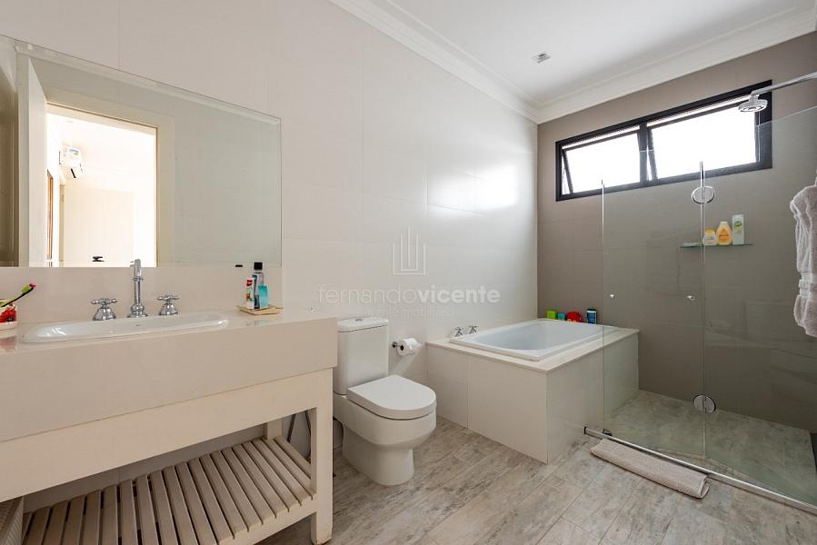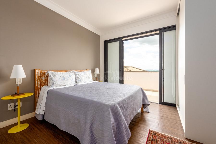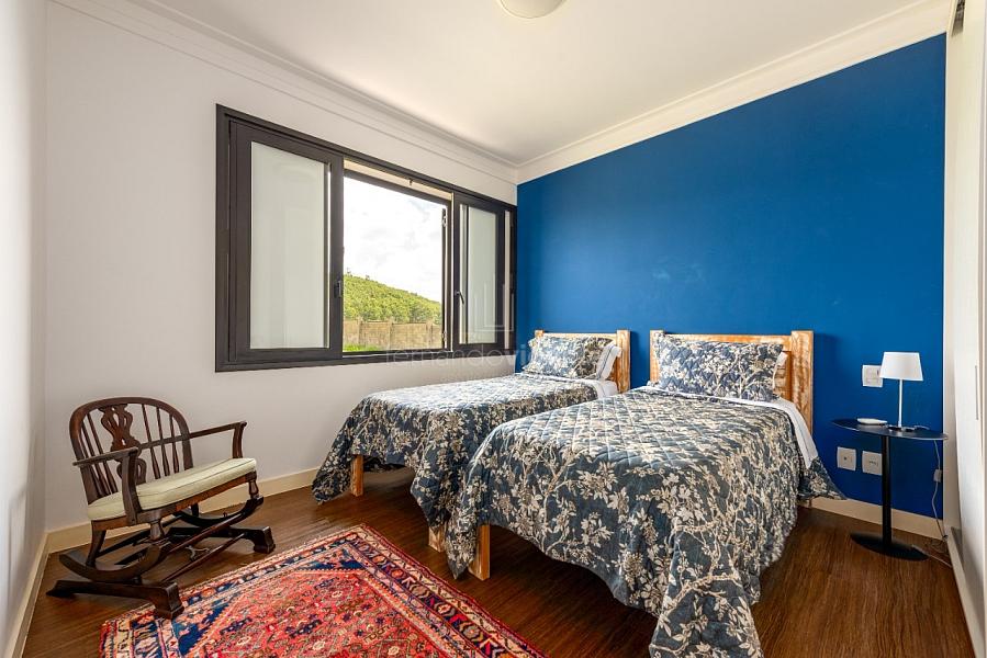 A residência conta com 4 suítes no piso superior, mais uma suíte térrea, todas com ar-condicionado e acabamentos que priorizam o conforto. Garagem para até 5 veículos.