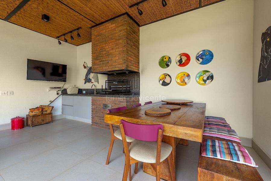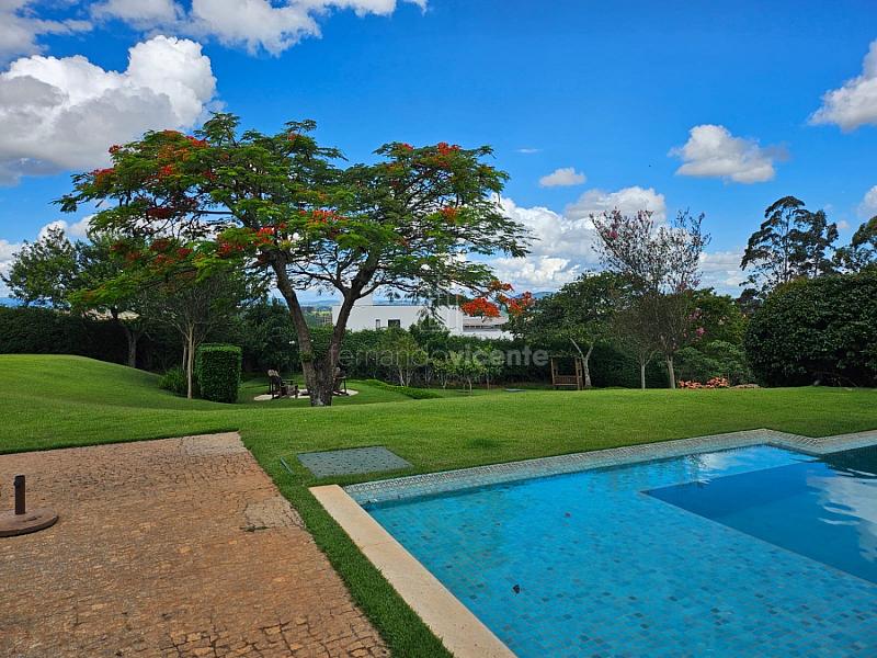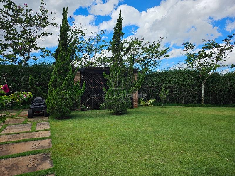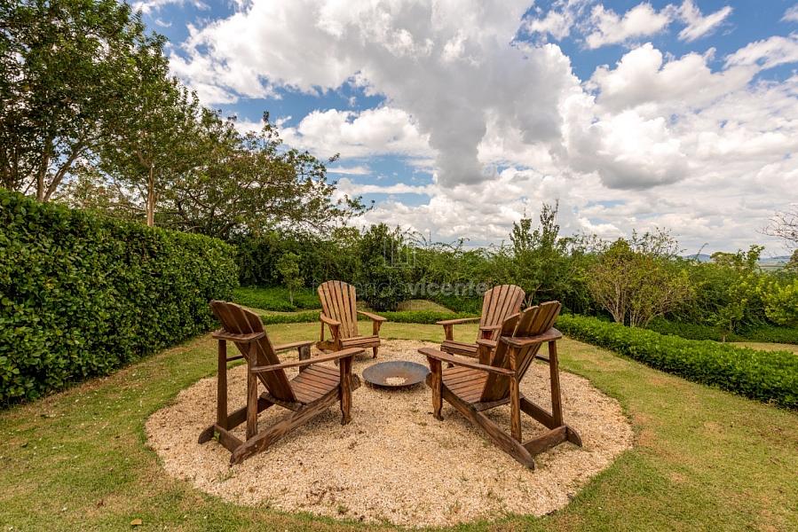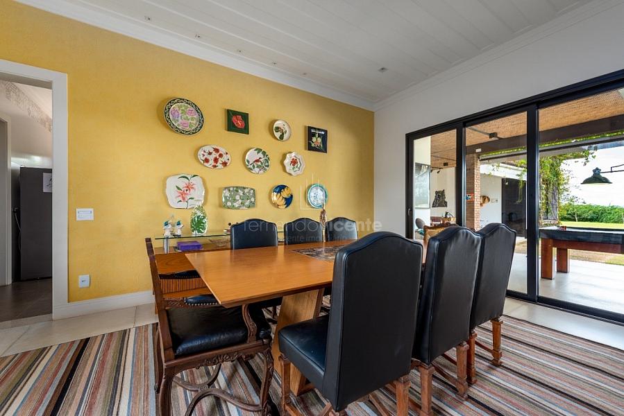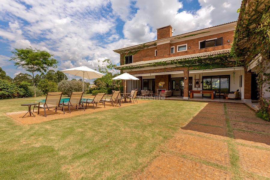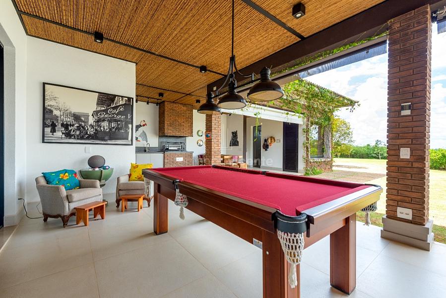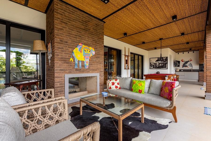 Amplo living com lareira, sala de jantar integrada, terraço com mesa de sinuca, espaço gourmet completo com churrasqueira, sauna, piscina e área de fogo de chão. O paisagismo é surpreendente, com orquidário, pomar e horta.