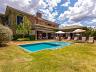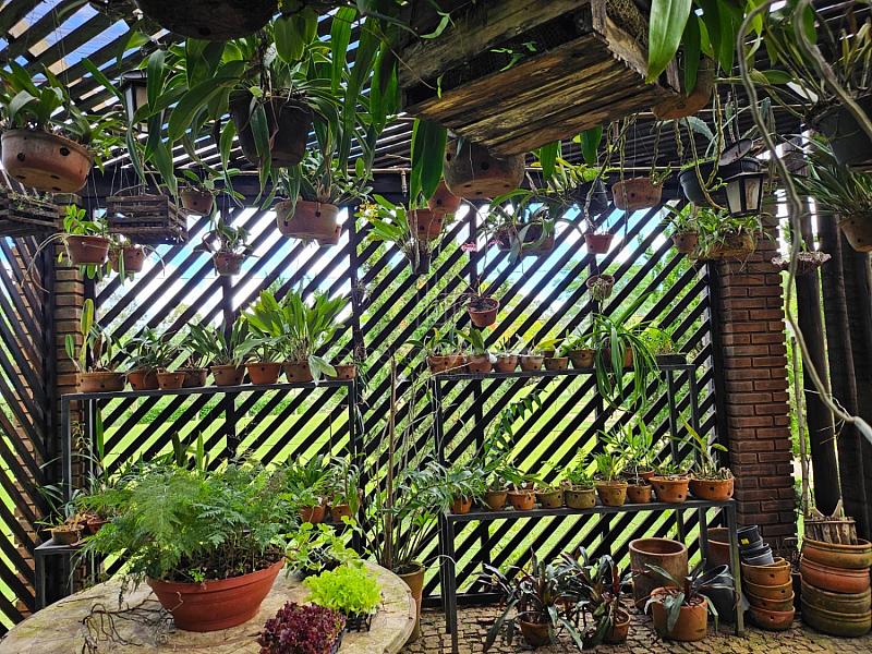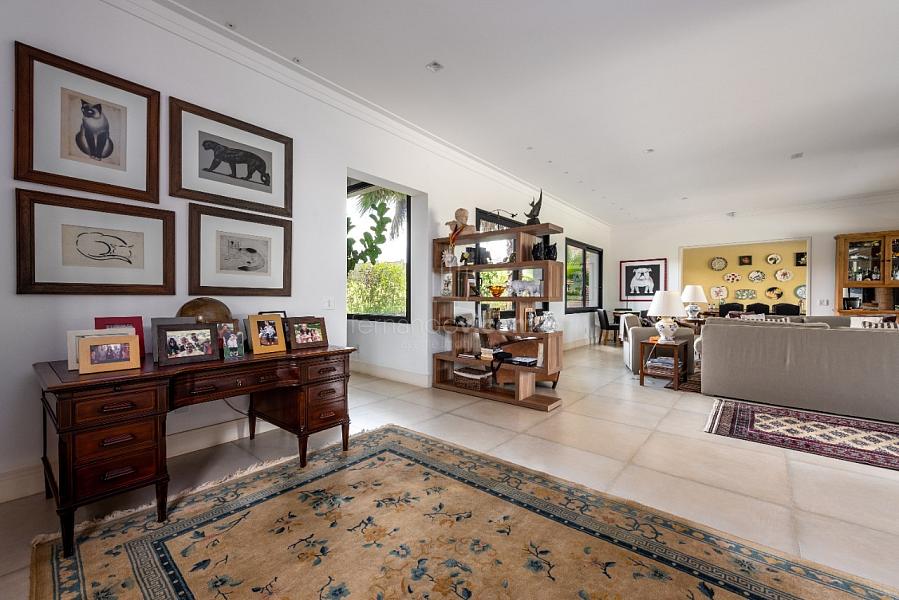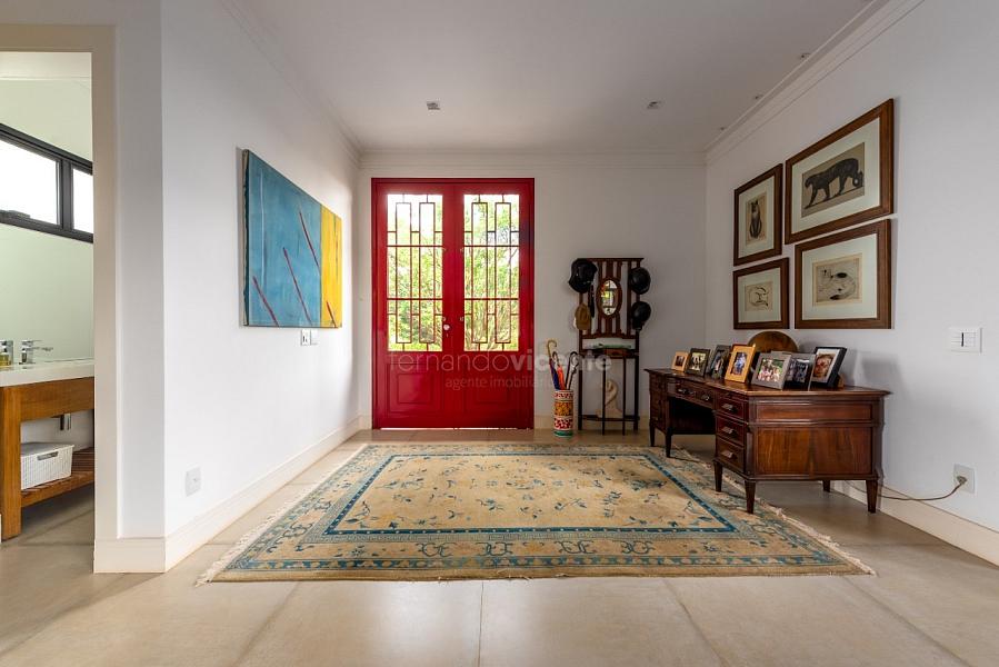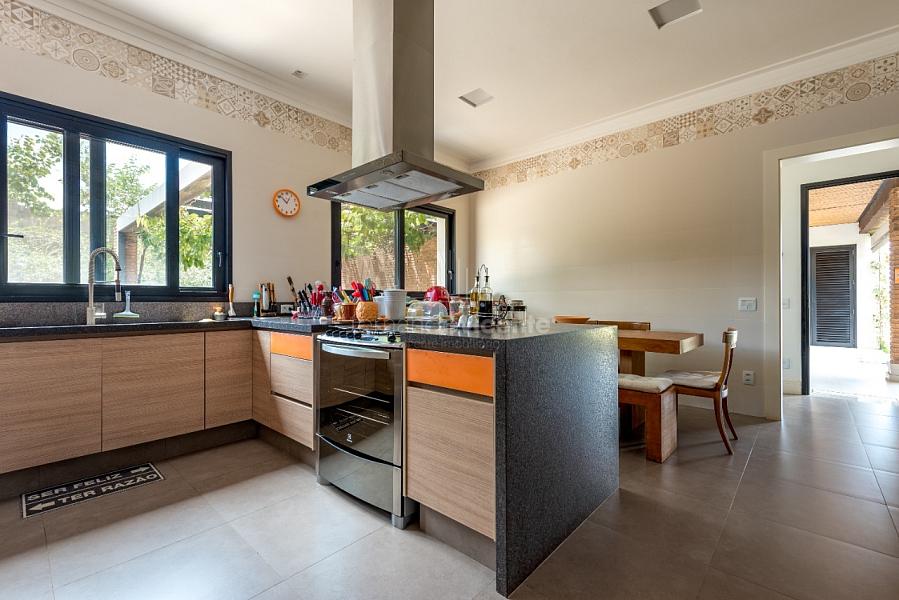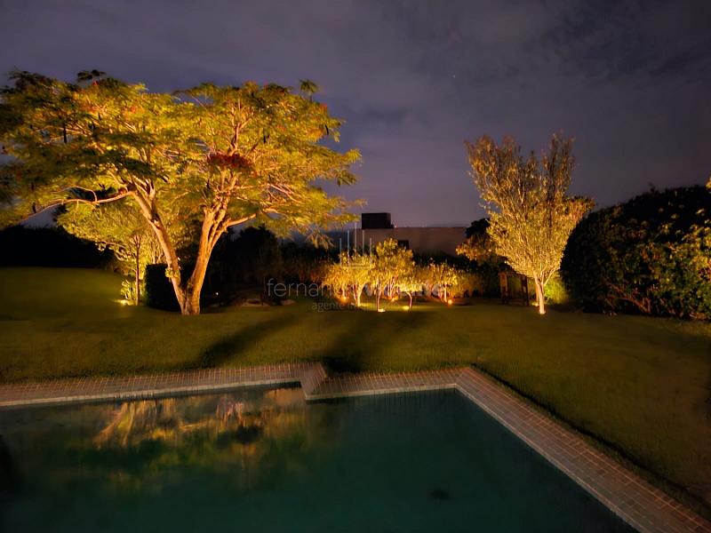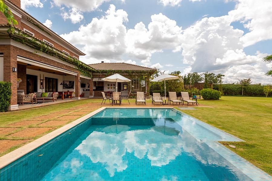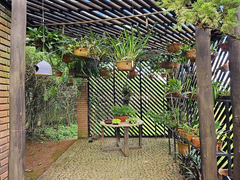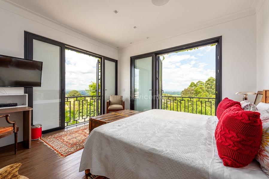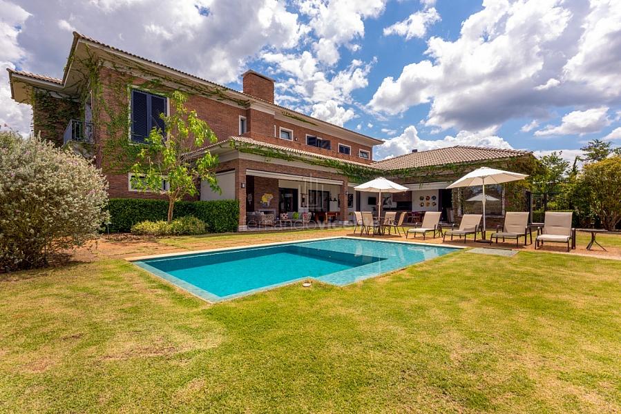 Amplo living com lareira, sala de jantar integrada, terraço com mesa de sinuca, espaço gourmet completo com churrasqueira, sauna, piscina e área de fogo de chão. O paisagismo é surpreendente, com orquidário, pomar e horta.