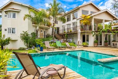 Excelente casa para locação, toda térrea, mobiliada, com 5 suítes, espaço gourmet, varanda, linda piscina, sauna, pomar, excelente arborização, localizada próximo ao clube e área de lazer do condomínio.