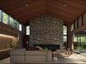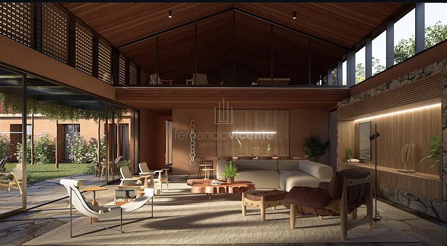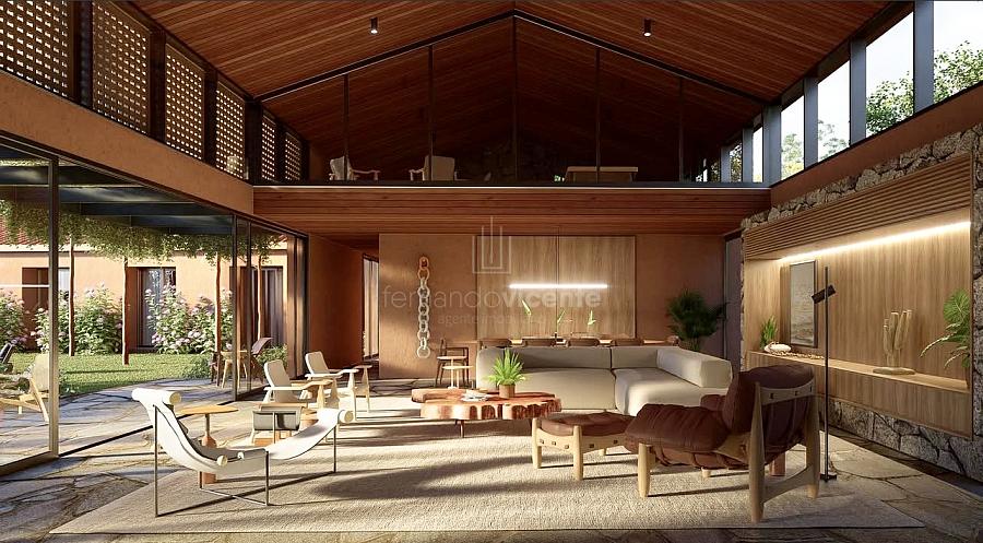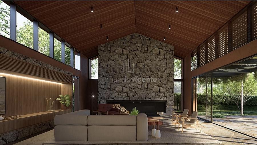 O projeto, no estilo Barn House com toques modernos, valoriza elementos naturais como pedra e madeira, criando uma atmosfera elegante e acolhedora. O amplo living integra sala de estar e jantar com pé direito duplo, lareira de pedra e grandes panos de vidro que conectam interior e exterior com fluidez. O mezanino multifuncional adiciona um espaço ideal para jogos, cinema ou leitura com total privacidade.