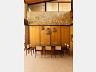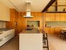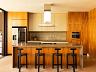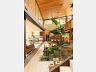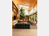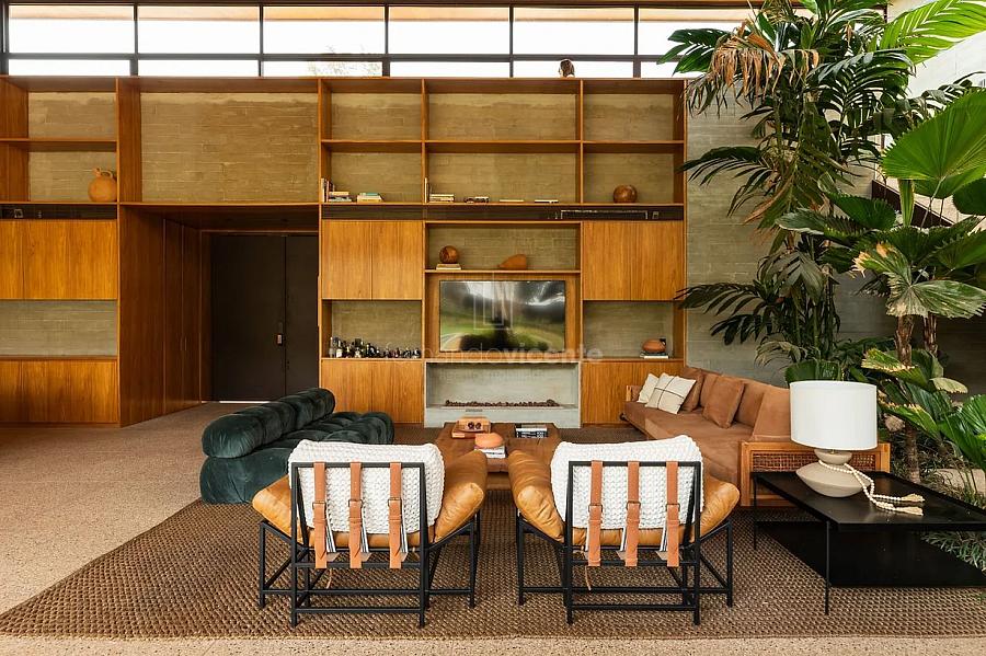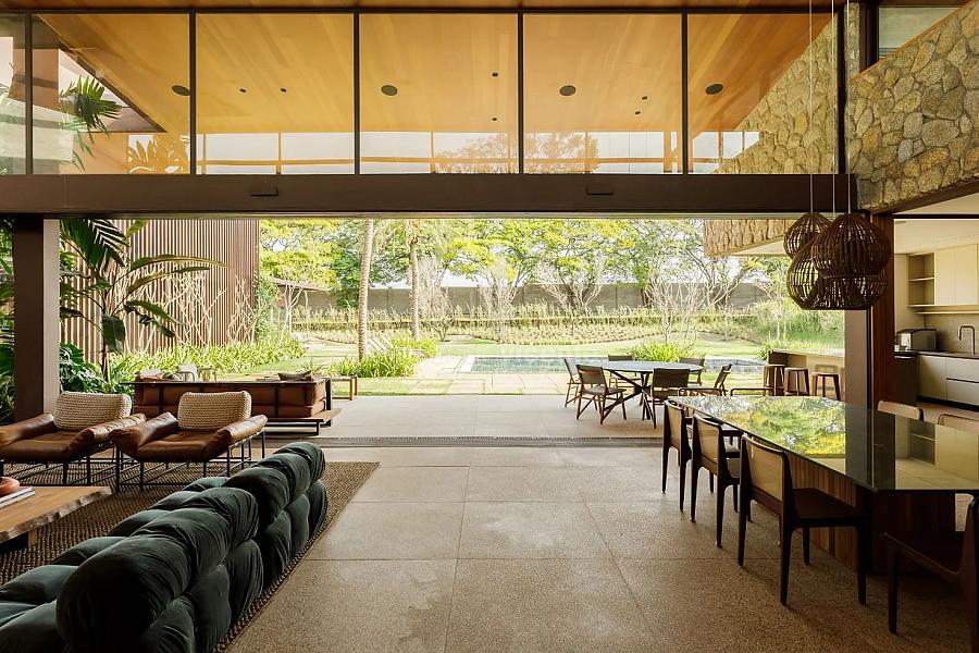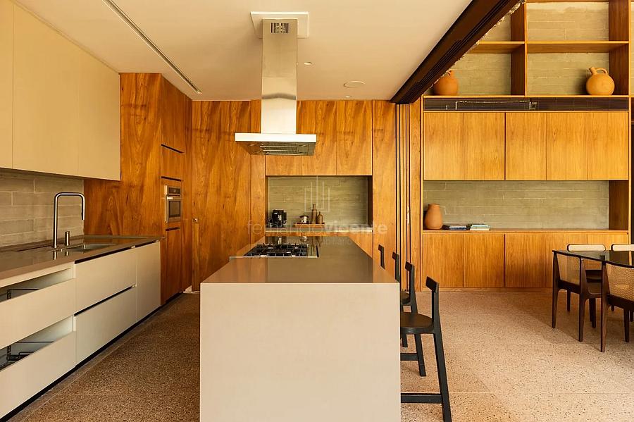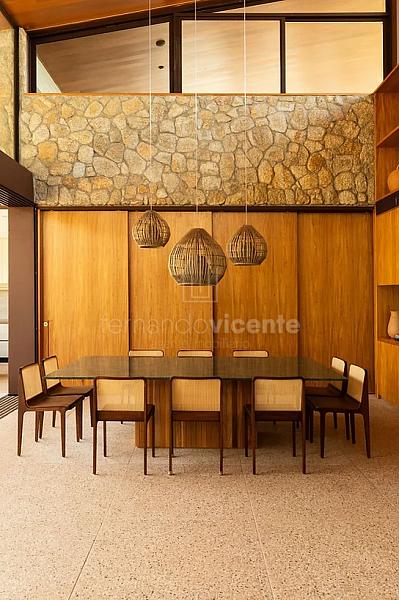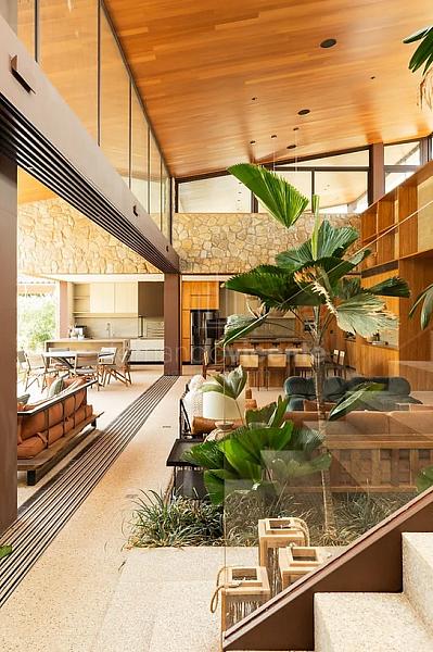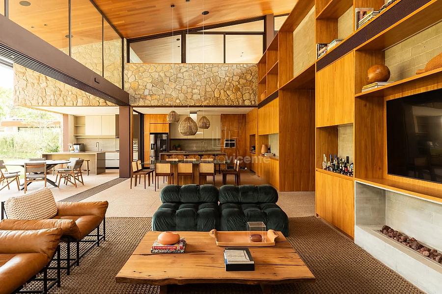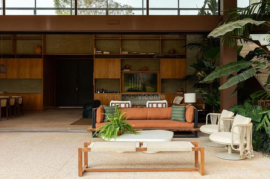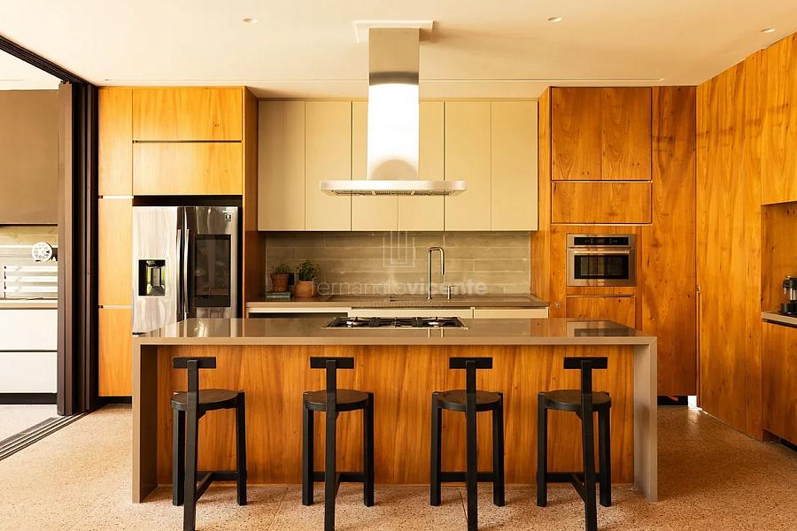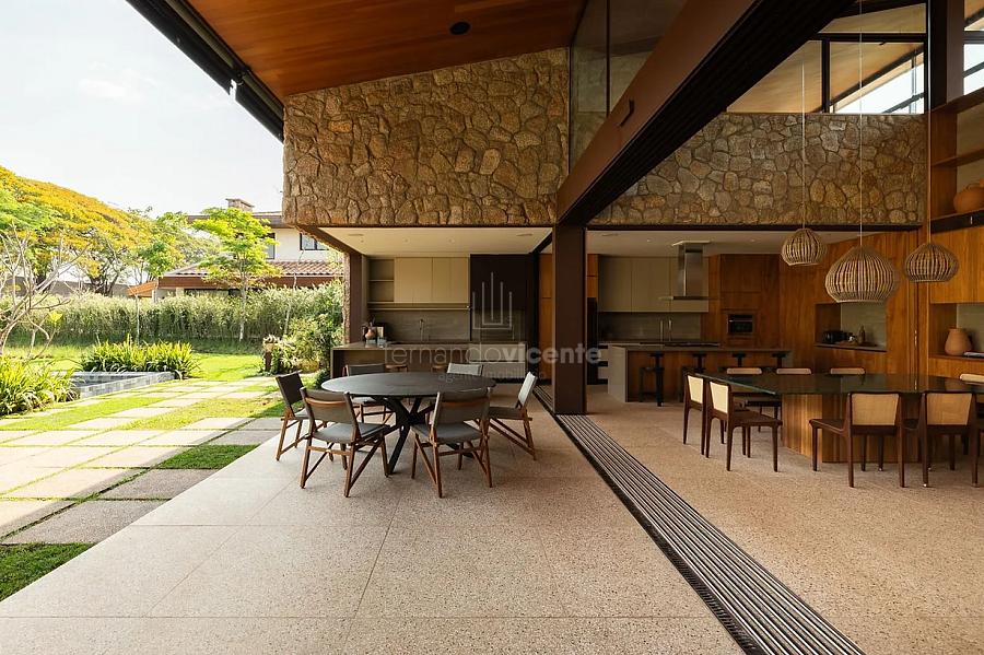 O living amplo integra sala de jantar e home theater no mezanino, com grandes aberturas que conectam os espaços internos ao verde ao redor. A cozinha é funcional e generosa, ideal para receber com praticidade. Conta ainda com lavabo e dependência para funcionários.