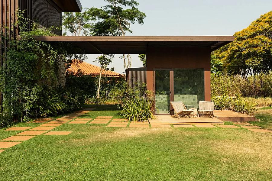Na área íntima, são cinco suítes confortáveis, incluindo uma suíte máster, que garantem privacidade e aconchego para todos. O lazer é completo: espaço gourmet, piscina com raia e spa, sauna e vestiário, tudo emoldurado pela tranquilidade do campo.