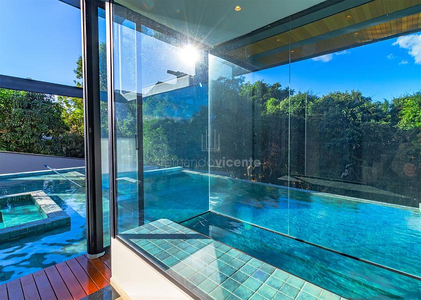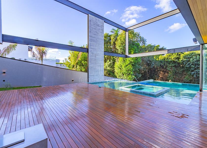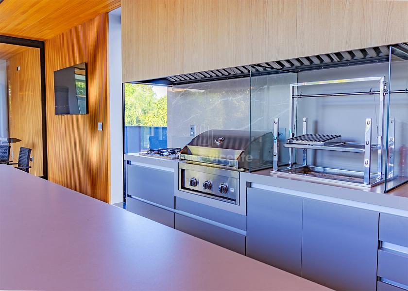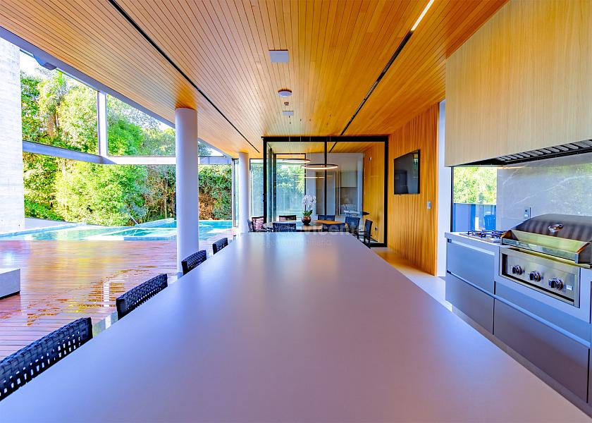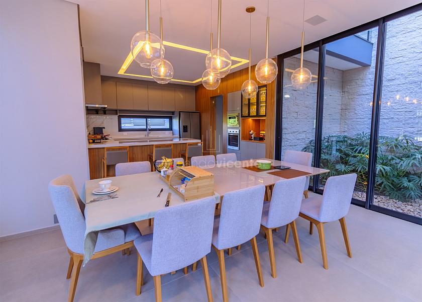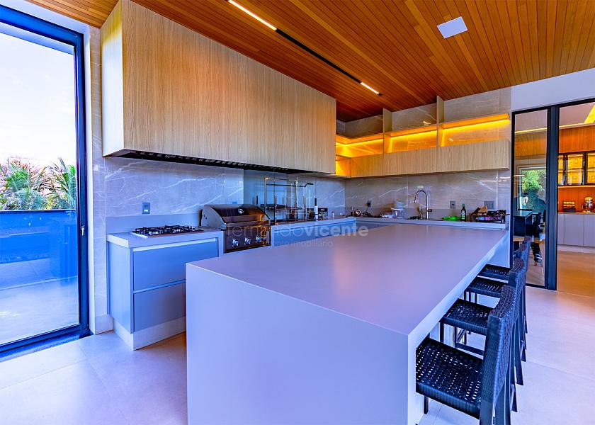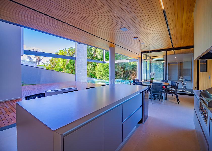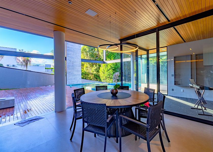 O ápice do lazer é a área externa, um verdadeiro santuário para relaxar e celebrar. A cozinha moderna se conecta diretamente a uma área gourmet completa, ideal para reunir amigos e familiares. O cenário é coroado por uma piscina deslumbrante, cercada por um paisagismo elegante e um espaço generoso para confraternizações. A propriedade ainda conta com 7 vagas de garagem, garantindo total comodidade para a família e visitantes.