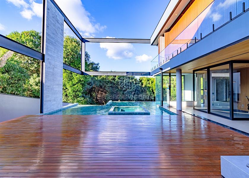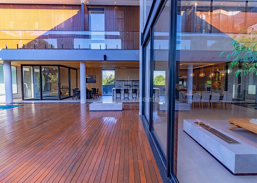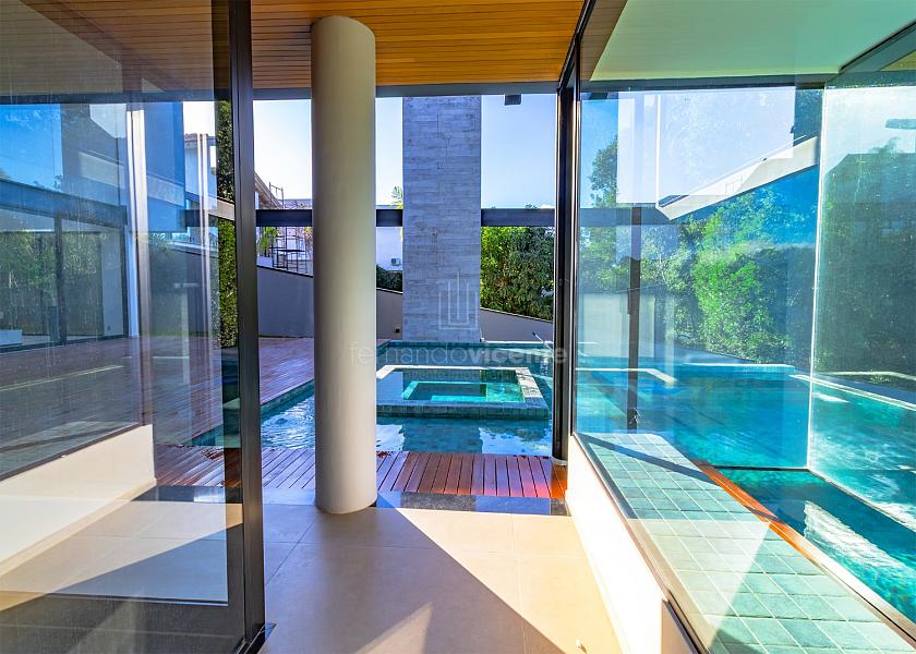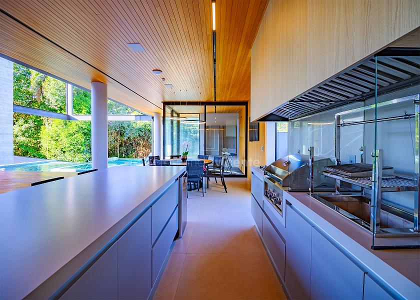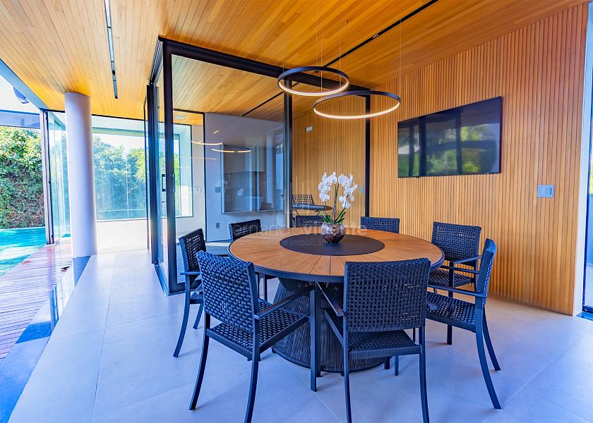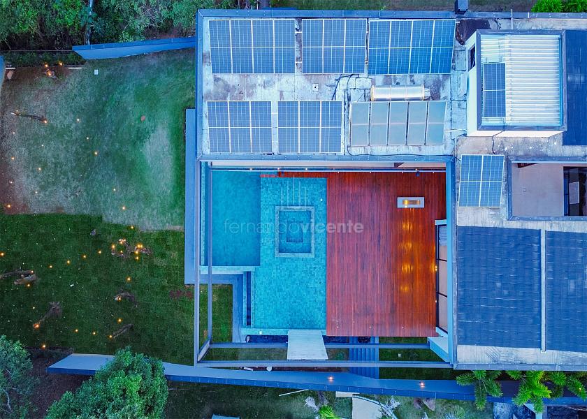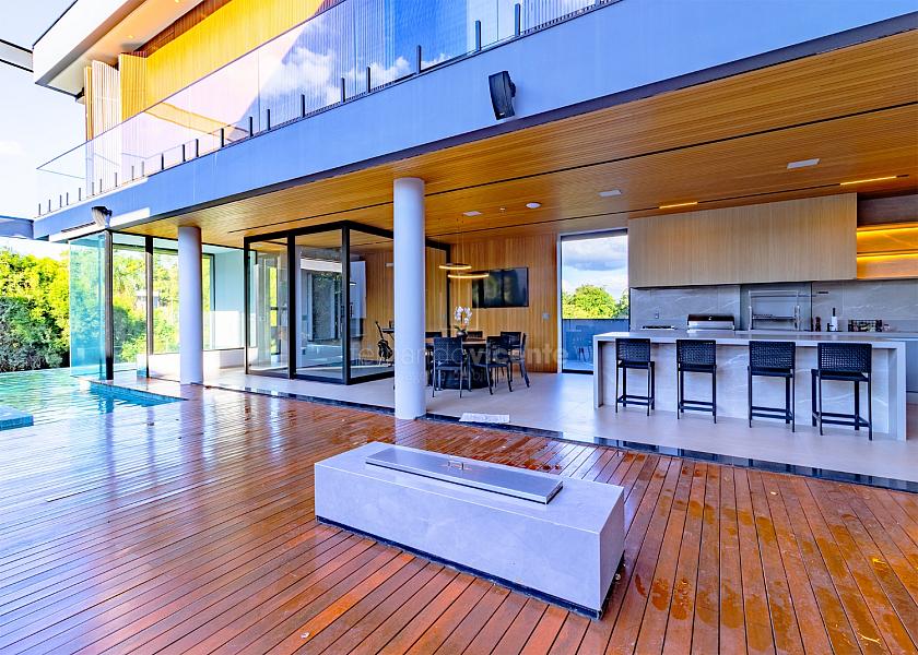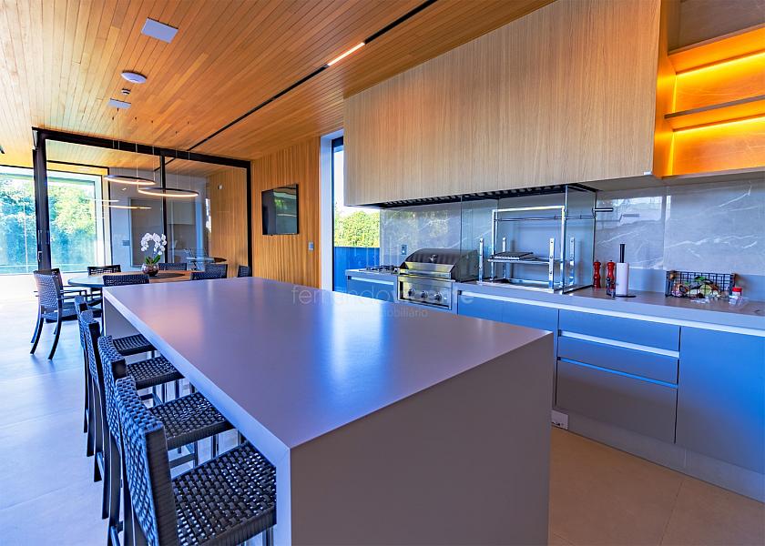 O ápice do lazer é a área externa, um verdadeiro santuário para relaxar e celebrar. A cozinha moderna se conecta diretamente a uma área gourmet completa, ideal para reunir amigos e familiares. O cenário é coroado por uma piscina deslumbrante, cercada por um paisagismo elegante e um espaço generoso para confraternizações. A propriedade ainda conta com 7 vagas de garagem, garantindo total comodidade para a família e visitantes.