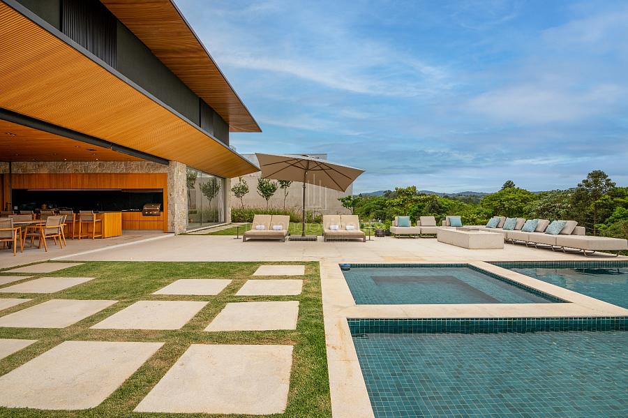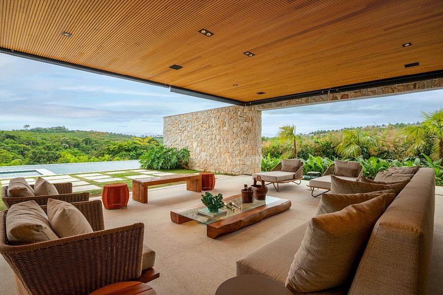 A casa é envolvida por um projeto paisagístico encantador, que valoriza cada detalhe do terreno. A ampla varanda oferece espaços de convivência confortáveis, como sofás, mesas e espreguiçadeiras, tudo conectado à área da piscina e ao jardim cuidadosamente planejado.