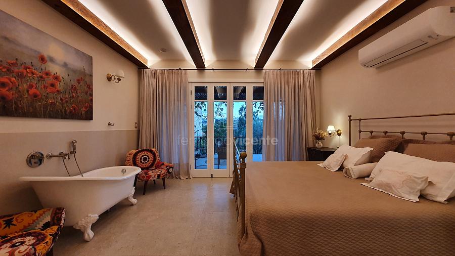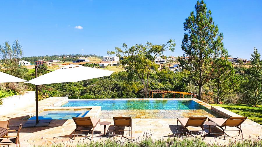 A residência abriga cinco suítes suntuosas, meticulosamente planejadas para oferecer o ápice do conforto e da privacidade. A suíte máster, um refúgio de puro deleite, encanta com uma banheira que convida ao relaxamento, um terraço privativo com vistas panorâmicas de tirar o fôlego e uma lareira que aquece as noites com um charme acolhedor e sofisticado.