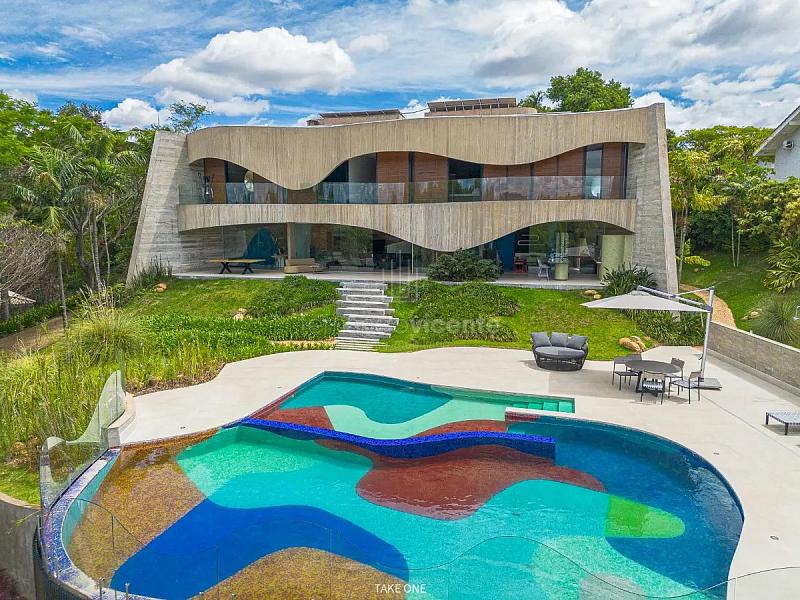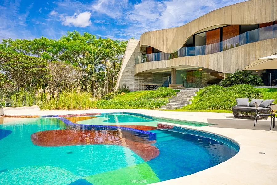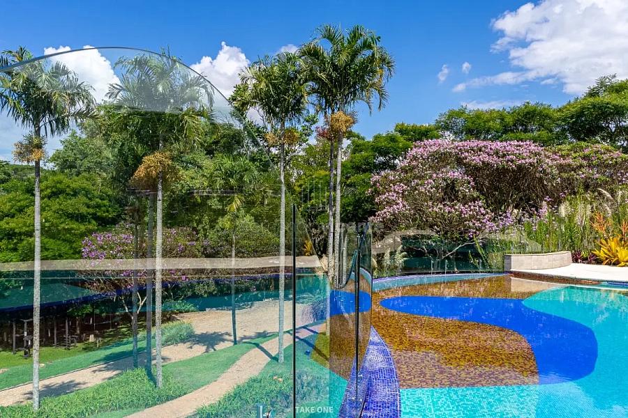 - Cenário Aquático: Uma piscina de borda infinita revestida em pastilhas de vidro coloridas, formando desenhos curvos que dialogam com a casa, culminando em um sereno lago repleto de carpas.