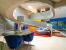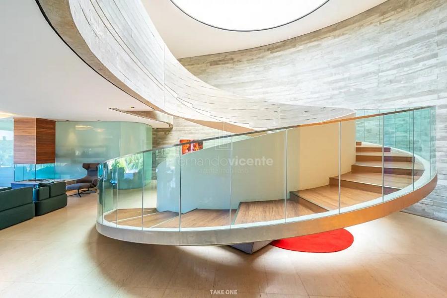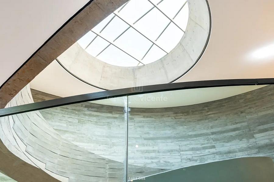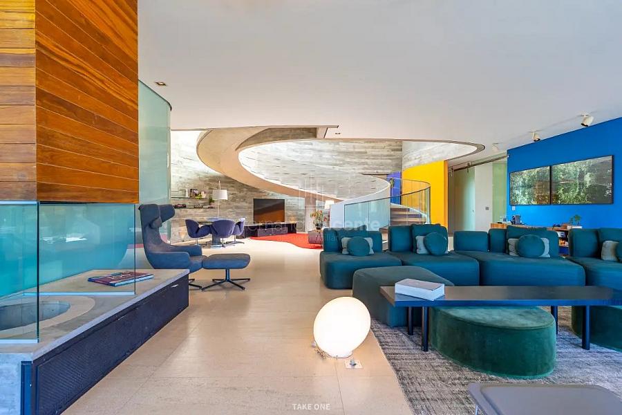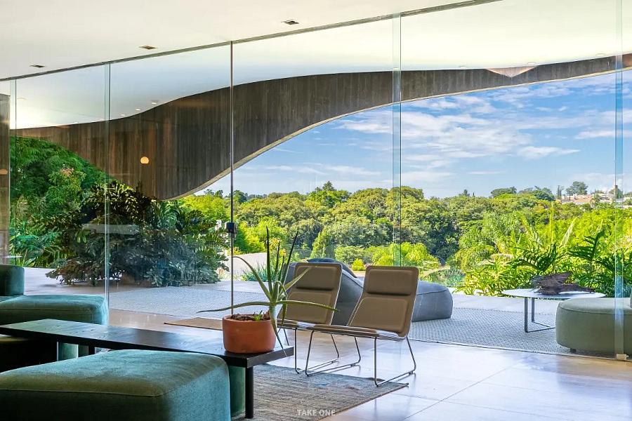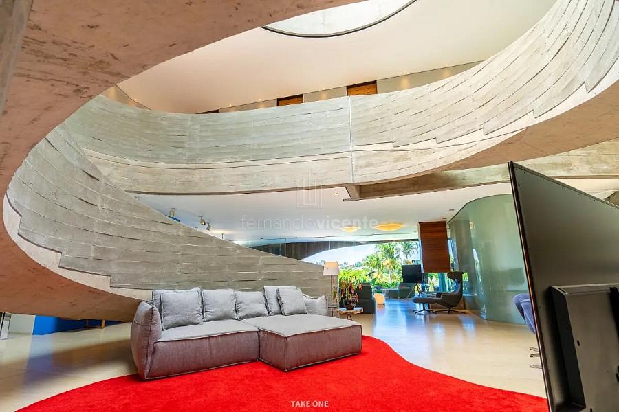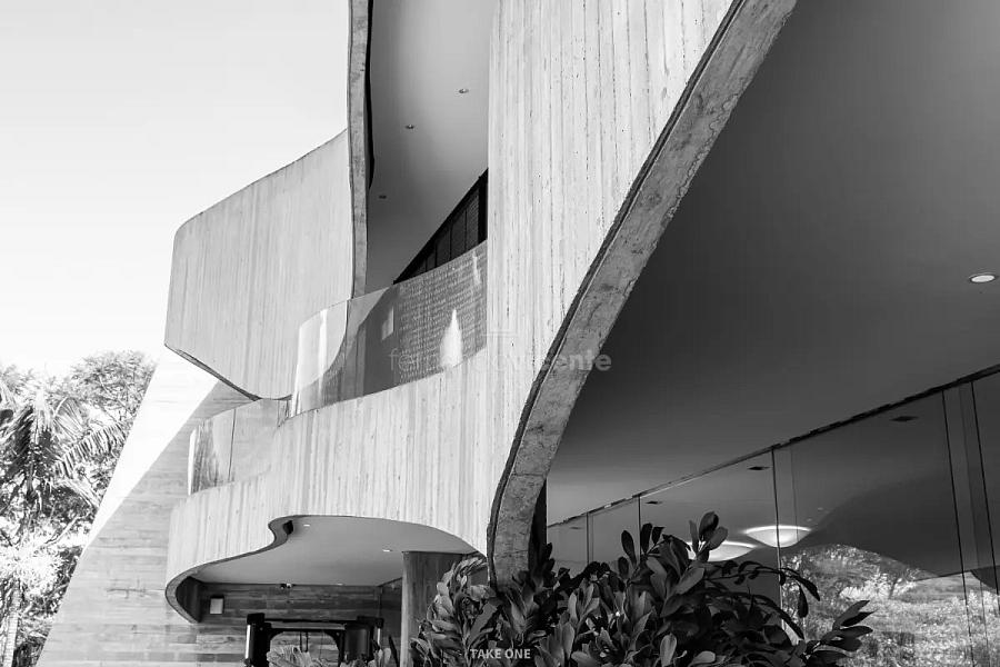A estrutura em concreto armado desafia a rigidez com curvas orgânicas que abraçam a natureza ao redor. O grande destaque é a rampa circular, uma escultura funcional que une os pavimentos e transforma a circulação em uma experiência estética. Recortes estratégicos e vãos de vidro garantem que a luz natural e o verde sejam parte da decoração de cada ambiente.