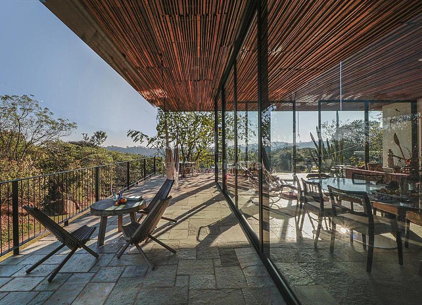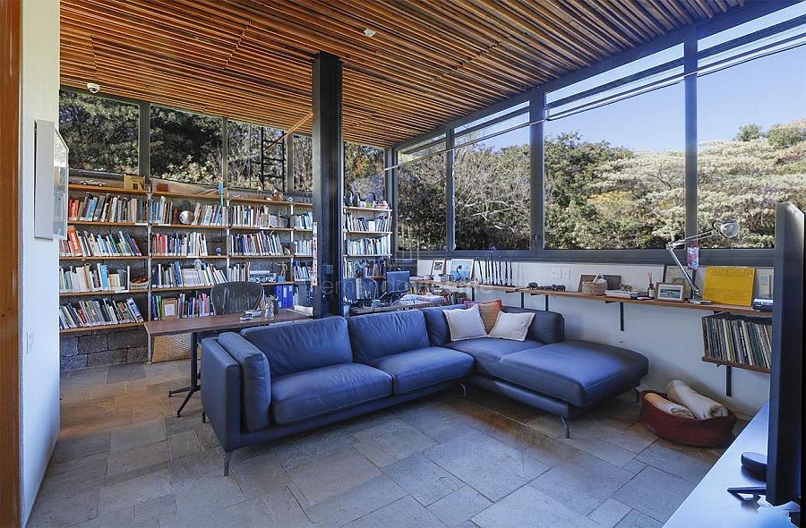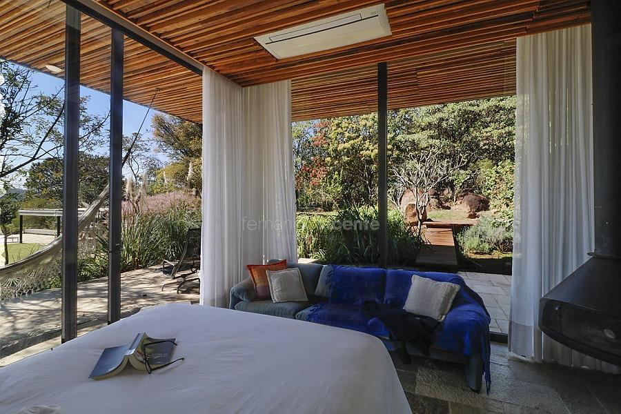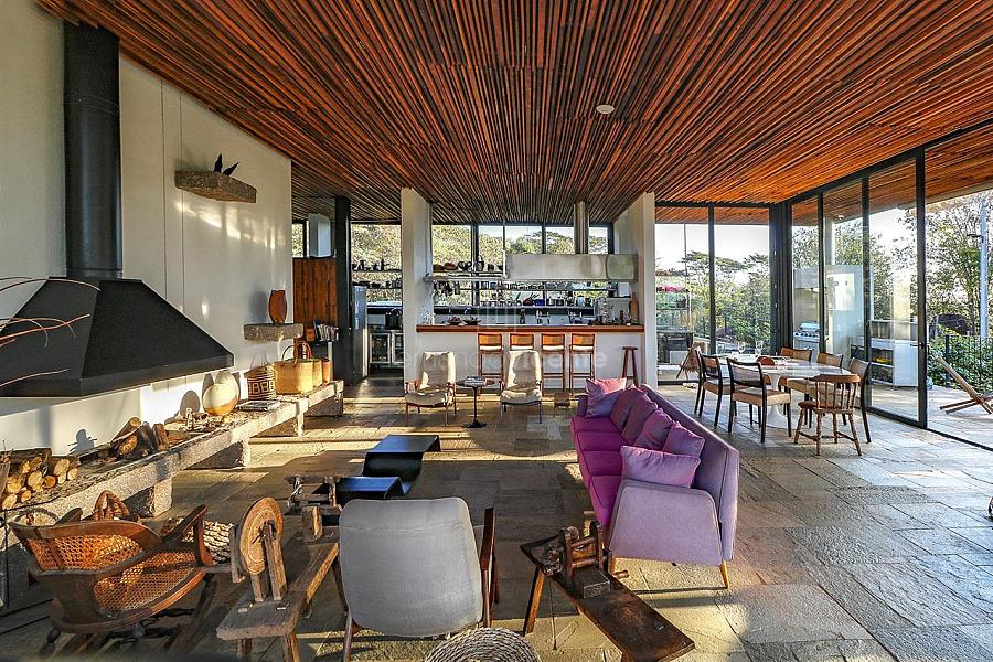 O espaço principal é dedicado à convivência, com uma casa projetada para oferecer conforto absoluto. Toda térrea, living amplo com pé-direito elevado mais lareira, é inundado de luz natural por portas de vidro do chão ao teto, que se abrem para uma varanda extensa. Com piso natural em pedra Goiás é todo aquecido, proporcionando aconchego em dias frios, enquanto o forro em madeira peroba rosa, de design orgânico, suaviza a acústica do ambiente ainda uma sala de TV e home office.