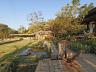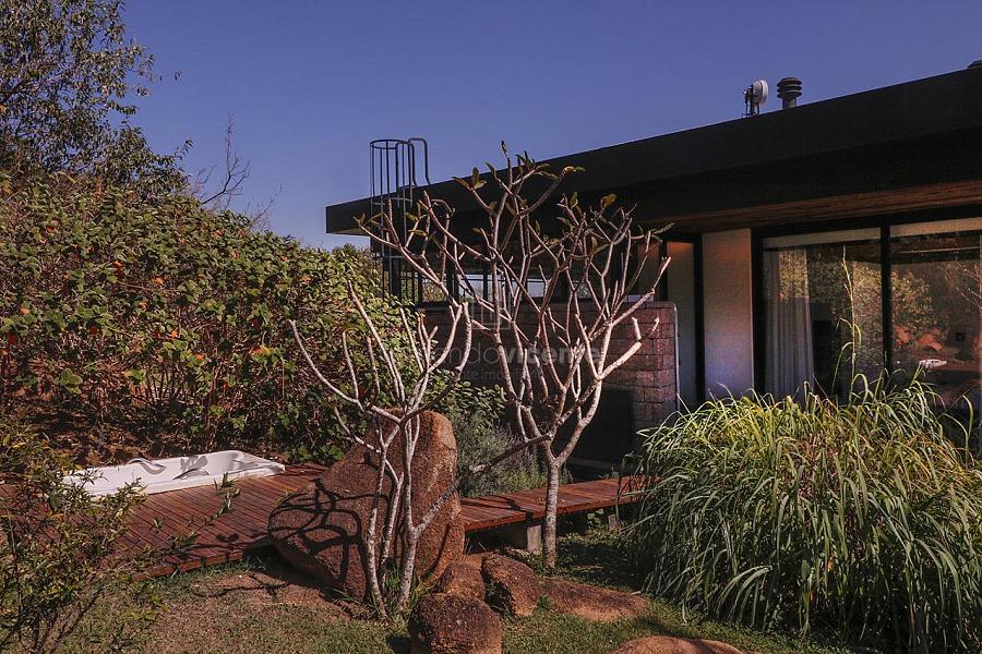 Ideal para hospedar convidados, a casa de apoio possui sala de estar com dois ambientes, três suítes e uma cozinha em estilo rústico, mantendo o conforto.