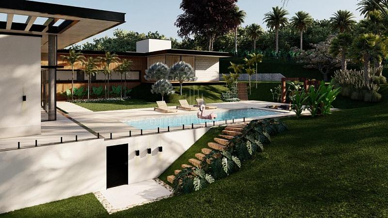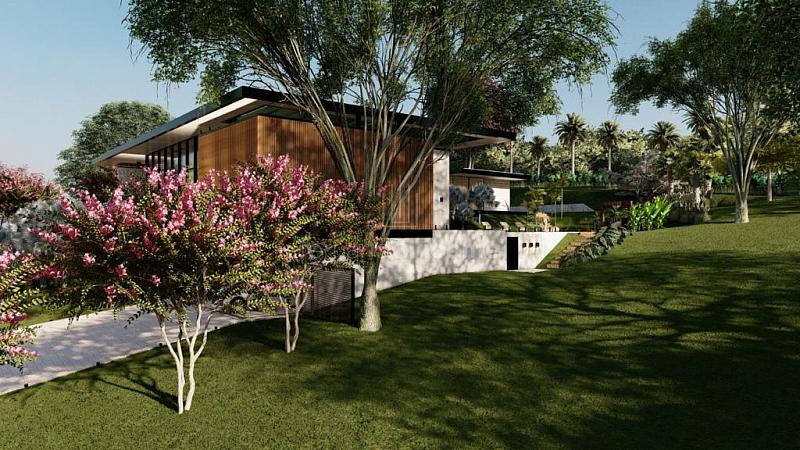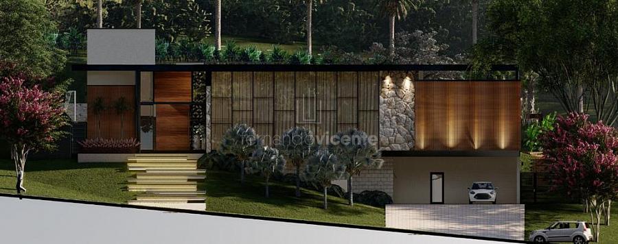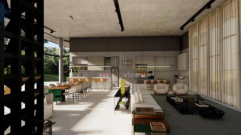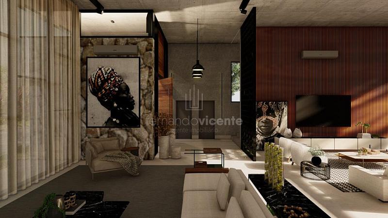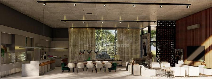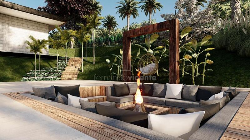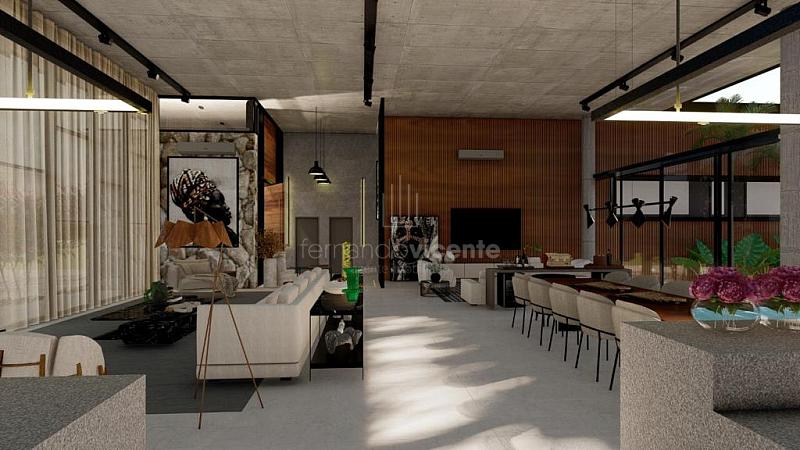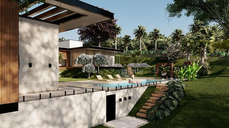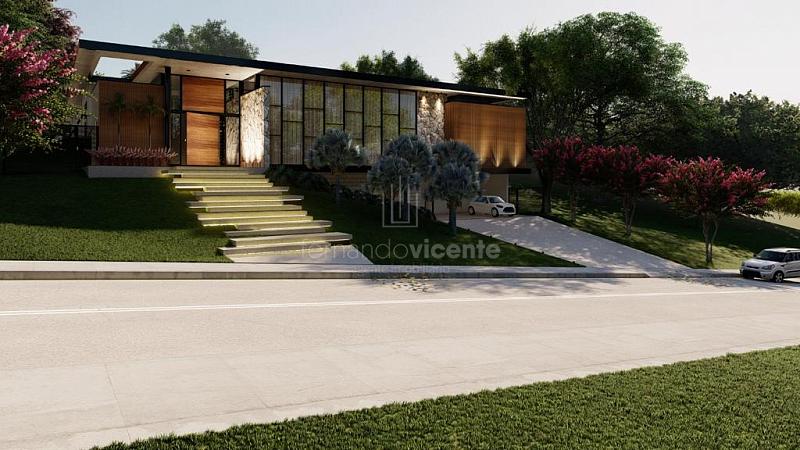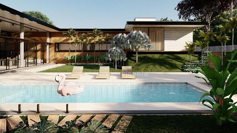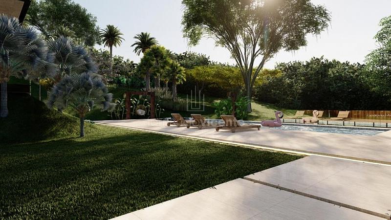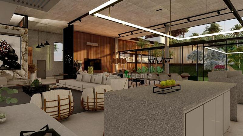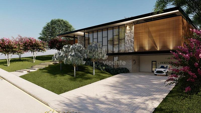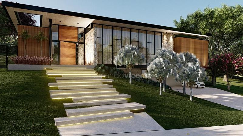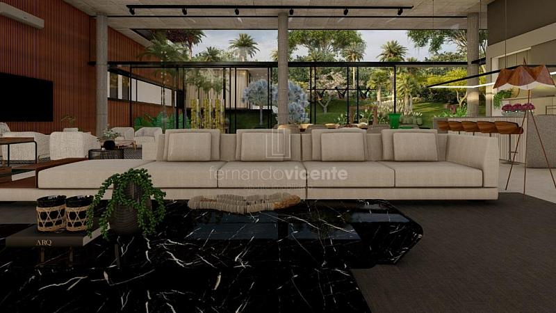 O projeto contempla 6 suítes, piscina, mini quadra, fogo de chão, sala com amplo pé direito, sala de TV e escritório.