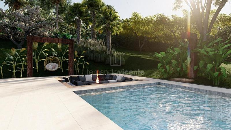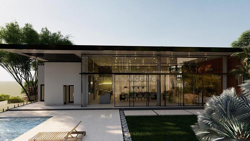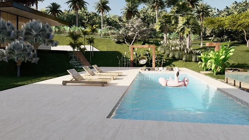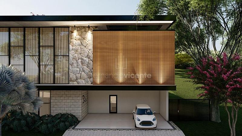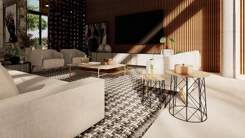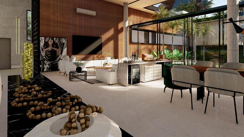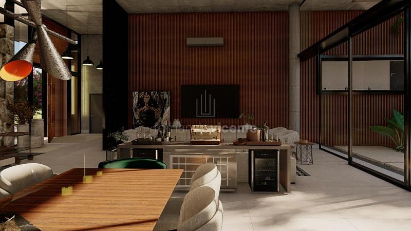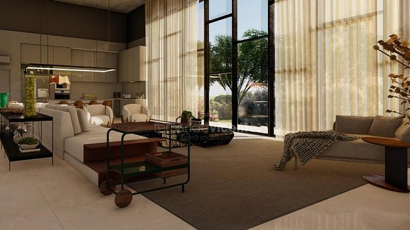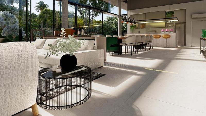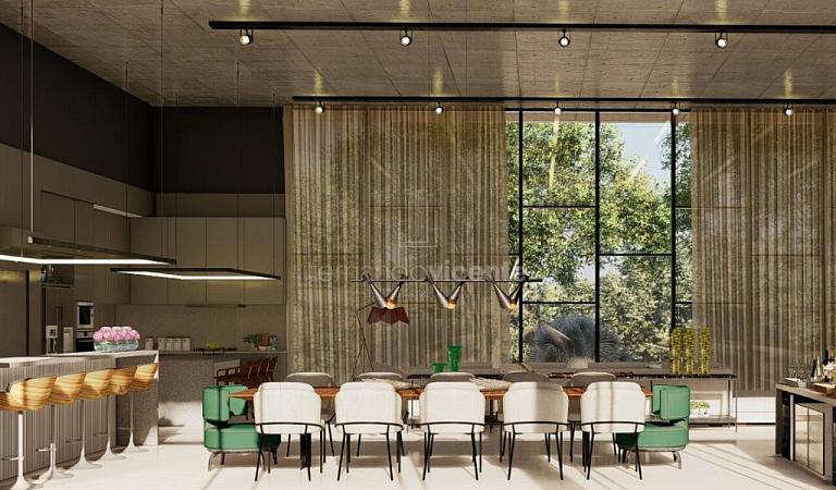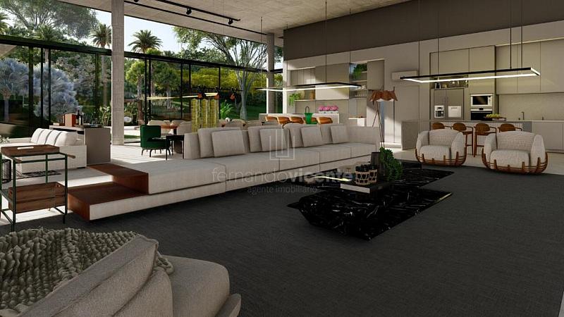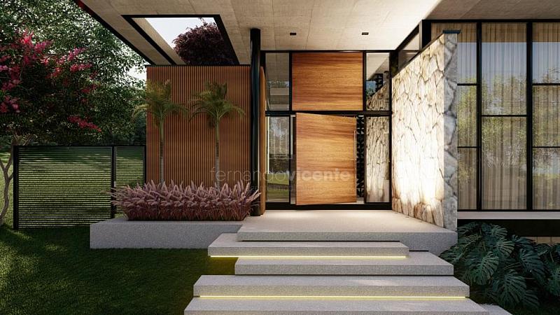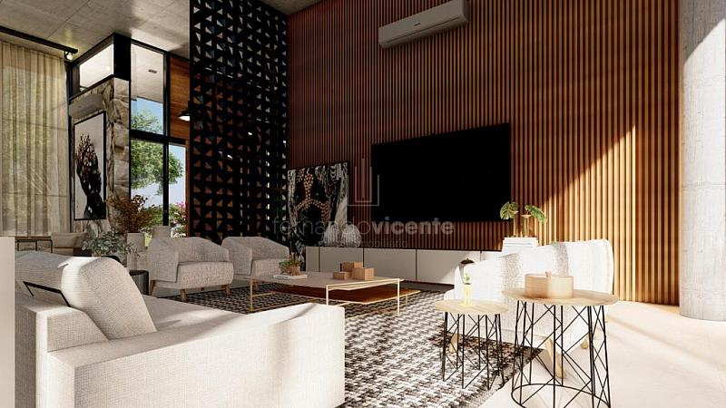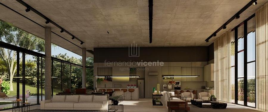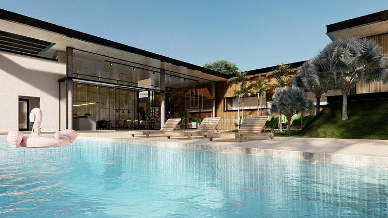 O projeto contempla 6 suítes, piscina, mini quadra, fogo de chão, sala com amplo pé direito, sala de TV e escritório.